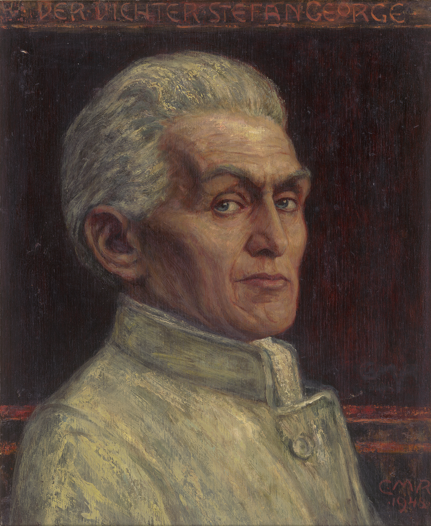 Unten rechts mit Pinsel in Rot monogrammiert "C.M.R", datiert und im Oberrand betitelt, verso mit Pinsel in Schwarz signiert "CARL MAX REBEL", nochmals datiert und bezeichnet "INSEL" sowie "Der Dichter Stefan George im 60. Lebensjahre 1928 / fecit 1948-1948".
