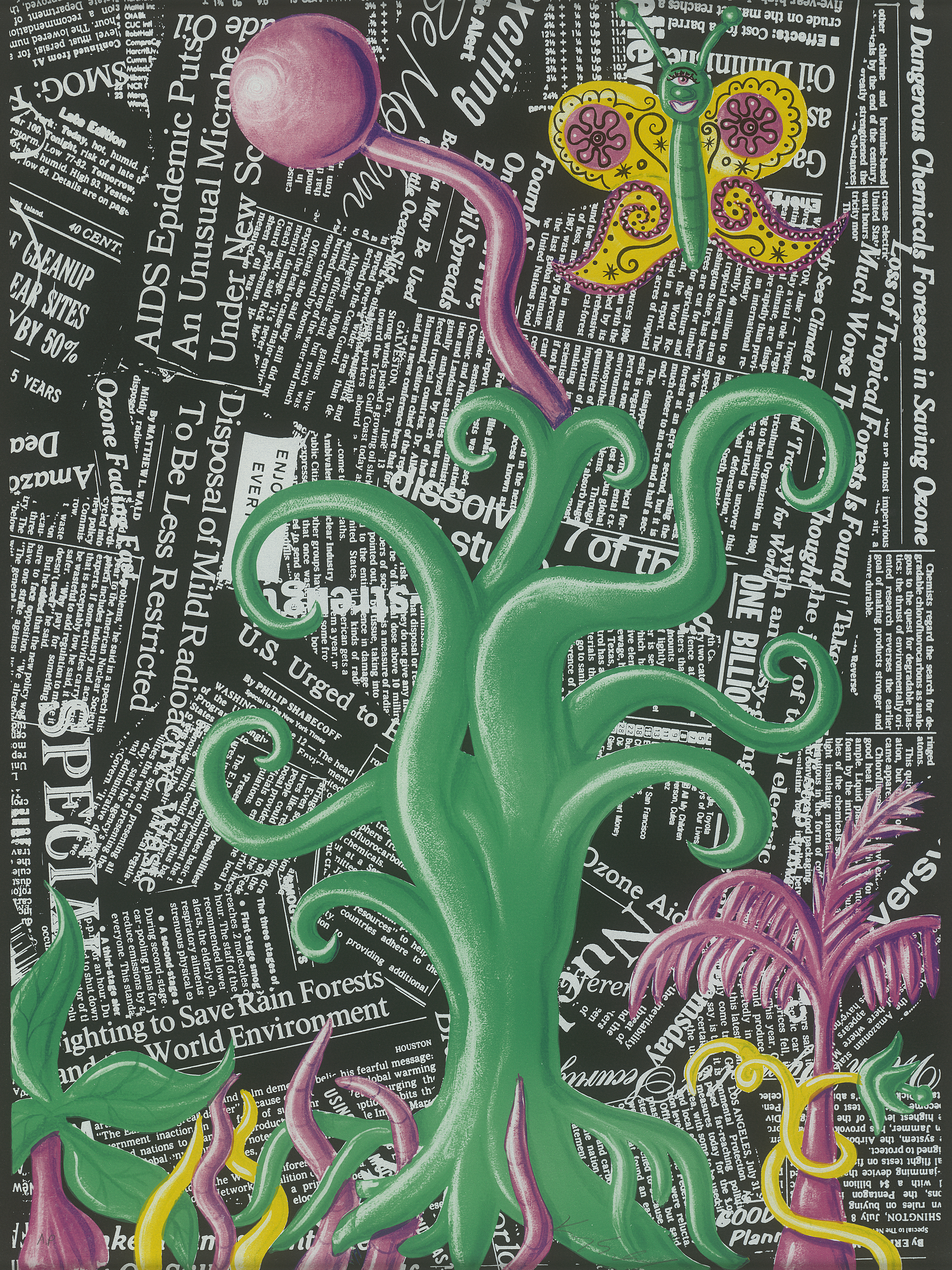 Erschienen im Mappenwerk "Columbus. In Search for a New Tomorrow", das im Zeichen von "Artists United for Nature" zur Rettung der tropischen Regenwälder entstand. Herausgegeben von der Edition Domberger, Filderstadt 1992, in einer Auflage von 100 numerierten Exemplaren, mit deren Blindstempel unten links. Prachtvoller Druck der formatfüllenden Komposition in leuchtender Farbigkeit.