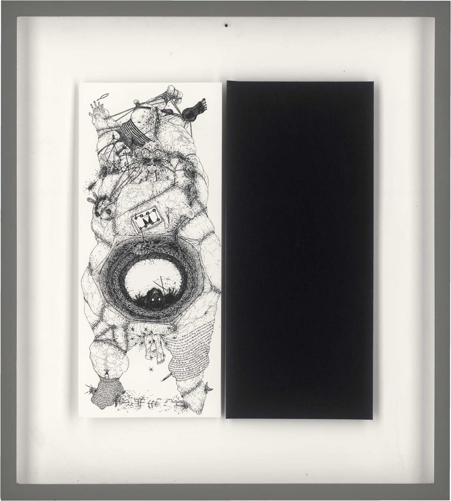 Die Figur von detailgenauer Absurdität zeichnet der Künstler mit feinster Feder, während gegenüber rechts eine Fläche tiefster Schwärze gähnt. Vermutlich entstand die Zeichnung während Ziervogels Aufenthalt in New York.