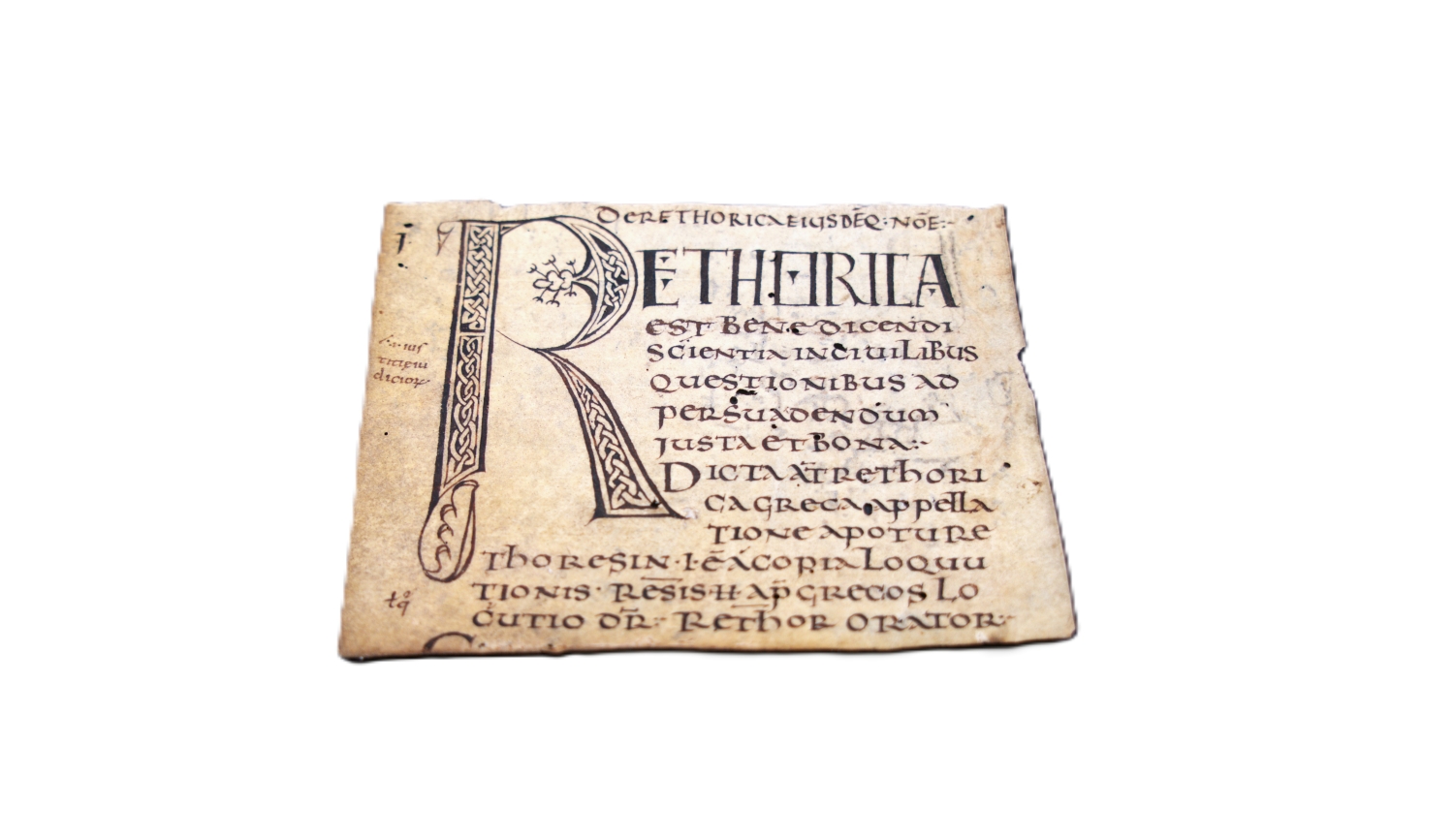 De retorica eiusdemque nomen". Incipit-Fragment einer lateinischen Handschrift auf Pergament.