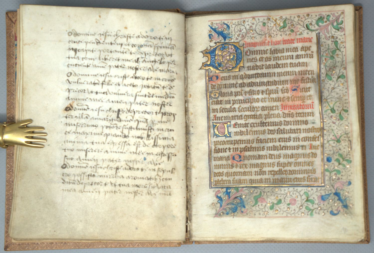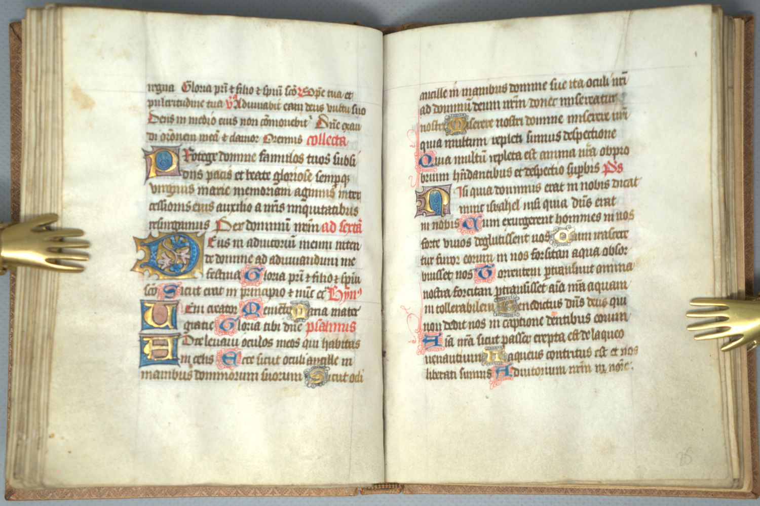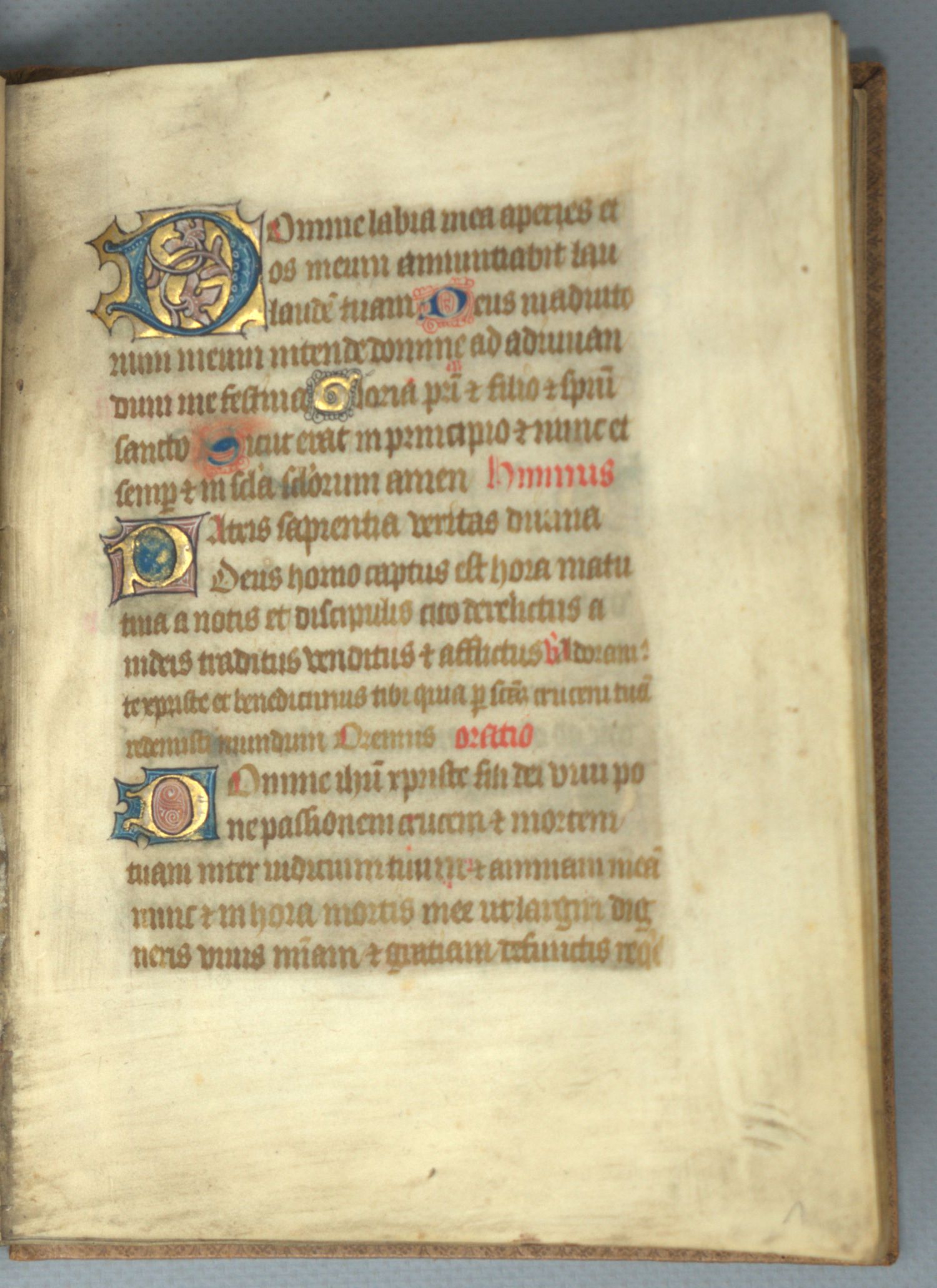 Horae BMV. Großes Fragment eines lateinischen Stundenbuchs des Spätmittelalters mit reicher Blattgold-Illumination und Ergänzungen des 16. Jahrhunderts. Lateinische Handschrift auf Pergament. Textualis von 2 oder 3 Händen. 94 S. auf 47 Bl. 18 Zeilen. Schriftraum 11,3 x 7,8 cm. Format 17 x 13 cm. Mit ca. 200 1-4-zeiligen Blattgold-Initialen auf Farbgrund mit Federwerk sowie einer Zierseite mit großer Initiale "D" in Gold und Farben (Bl. 10r), Blattgoldbordüren mit Feder- und Blattwerk sowie Goldpunkten. Hellbrauner Schweinslederband (kaum fleckig, Gelenke leicht schwach). Flandern (vermutlich Gent) um 1450.
