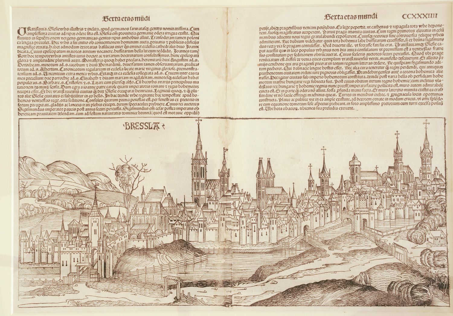 Schedel, Hartmann. Vedute der Stadt Breslau aus dem "Liber chronicarum". Doppelblattgroßes Einzelblatt mit großer Stadtansicht sowie einigen weiteren figürlichen Textholzschnitten. 44 x 62 cm. Unter Glas mit Passepartout in golgeprägter Holzprofilleiste. Nürnberg, Anton Koberger, 1493.