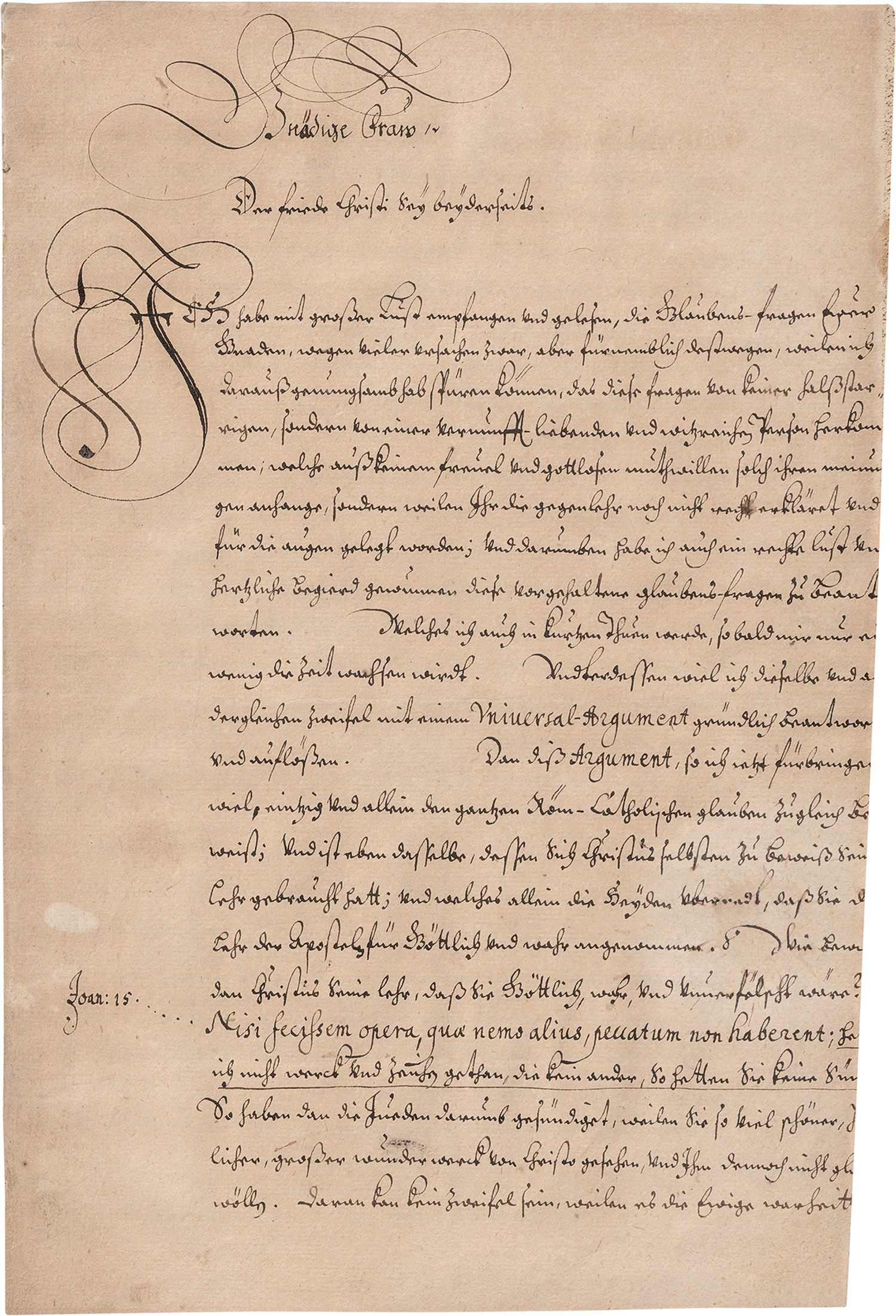 Eines umfangreiche Disputation und Abhandlung über die Glaubwürdigkeit und Integrität der katholischen Lehre des Rektors des Breslauer Jesuitenkollegs, unterschrieben "Ihrer Gnaden Dienstwilliger in Christo Balthasar Conradus S. I. Coll. Vratisl. Rector" (1609-1660).
