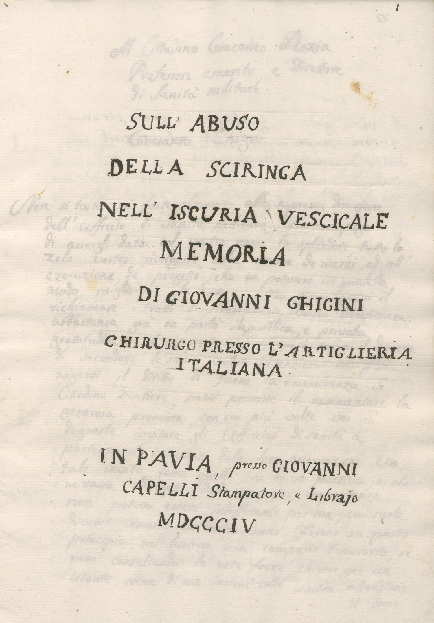 Ghigini, Giovanni. "Sull’abuso della sciringa [sic] nell’iscuria vesicale. Memoria di Giovanni Ghigini chirurgo presso l’artiglieria italiana. In Pavia, presso Giovanni capelli stampatore e libraio, MDCCCIV". Italienischen Handschrift auf Papier. 1 w. Bl., 19 num. S., 3 w. Bl. 28,5 x 20 cm. Fadengeheftet. Pavia nach 1804.
