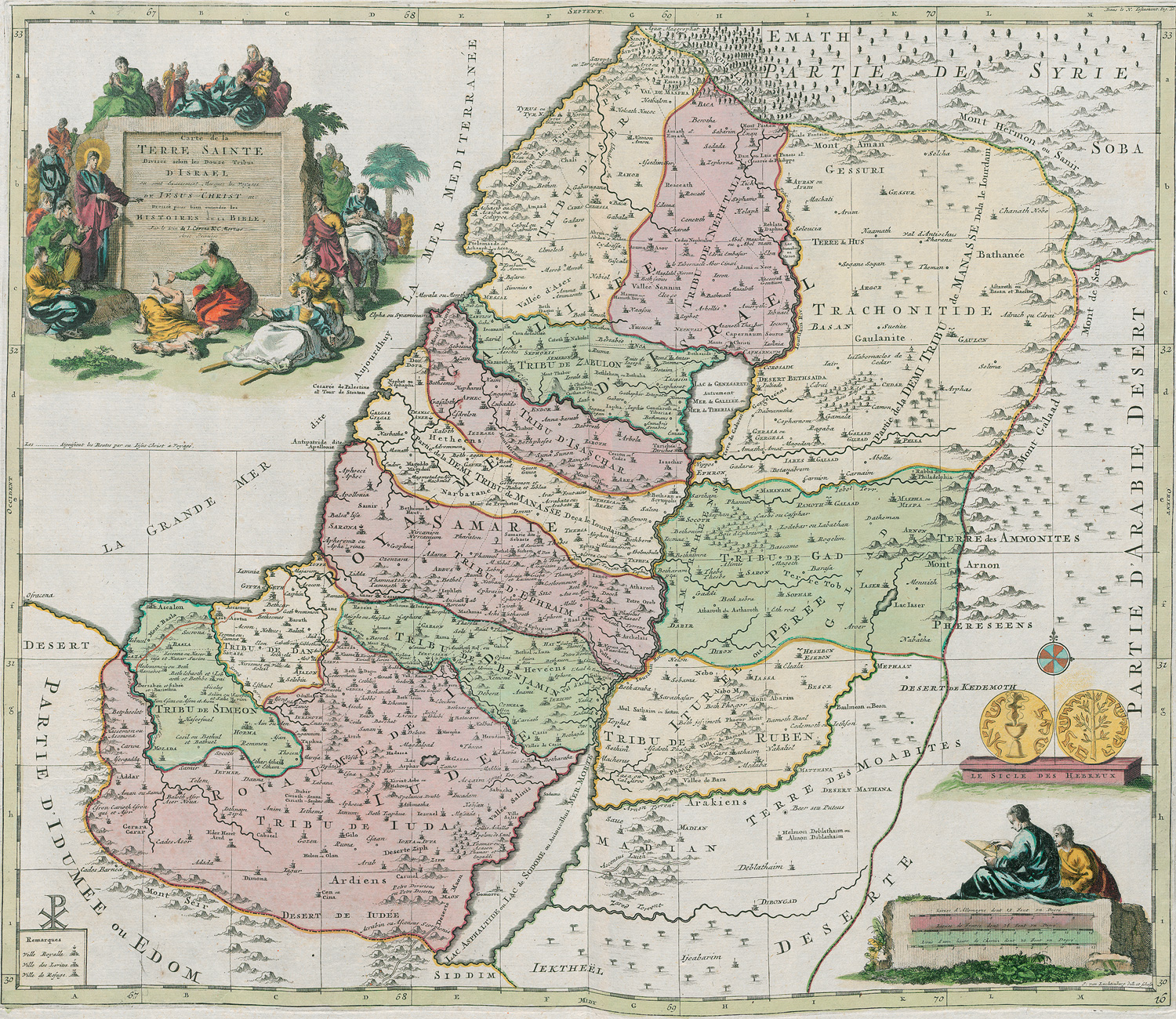 Mortier, Cornelius und Jean Covens. Carte de la terre Sainte divisée selon les douze tribus d'Israel. Grenz- und Flächenkolorierte Kupferkarte. 40 x 47 cm (Plattenrand). Amsterdam, Covens & Mortier, 1755.