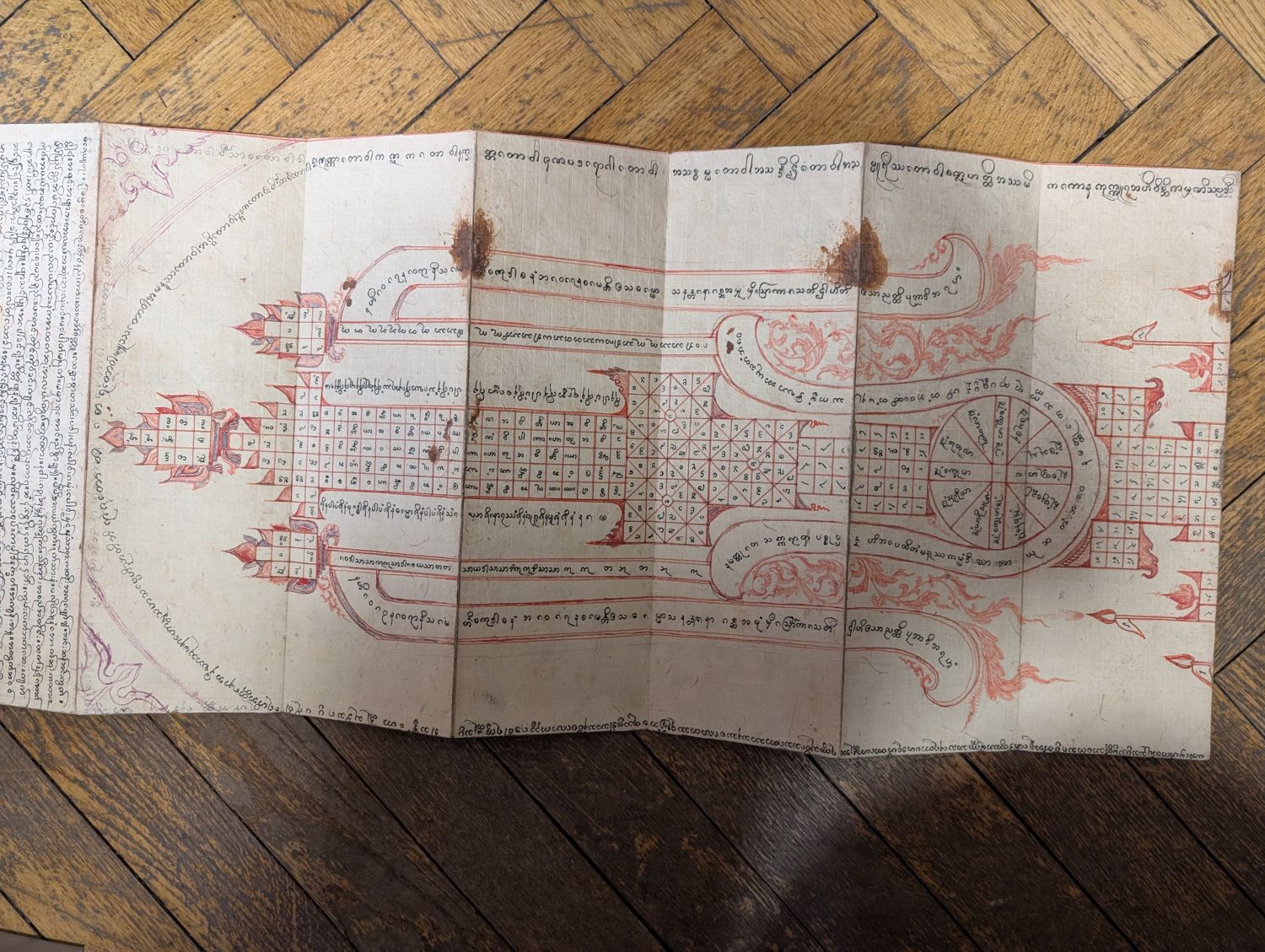 2) Schwarzes Parabaik, wohl mit enigmatischen Weissagungen und religiösen Prophezeihungen. 12 Kompartimente. 17 x 39 cm. Ausgefaltet 204 x 39 cm. Birmanische Abugida in Schwarz, Rot und Bleistift. Mit zentralem Schlangegeflecht-Symbol und 10 figürlichen Darstellungen sowie Tabellen und kalligraphisch umschriebenen Symbolfiguren. Teils in Feder, Bleistift mit Rot gehöht. Schwarz-dunkelbraune Khoi-Deckel.