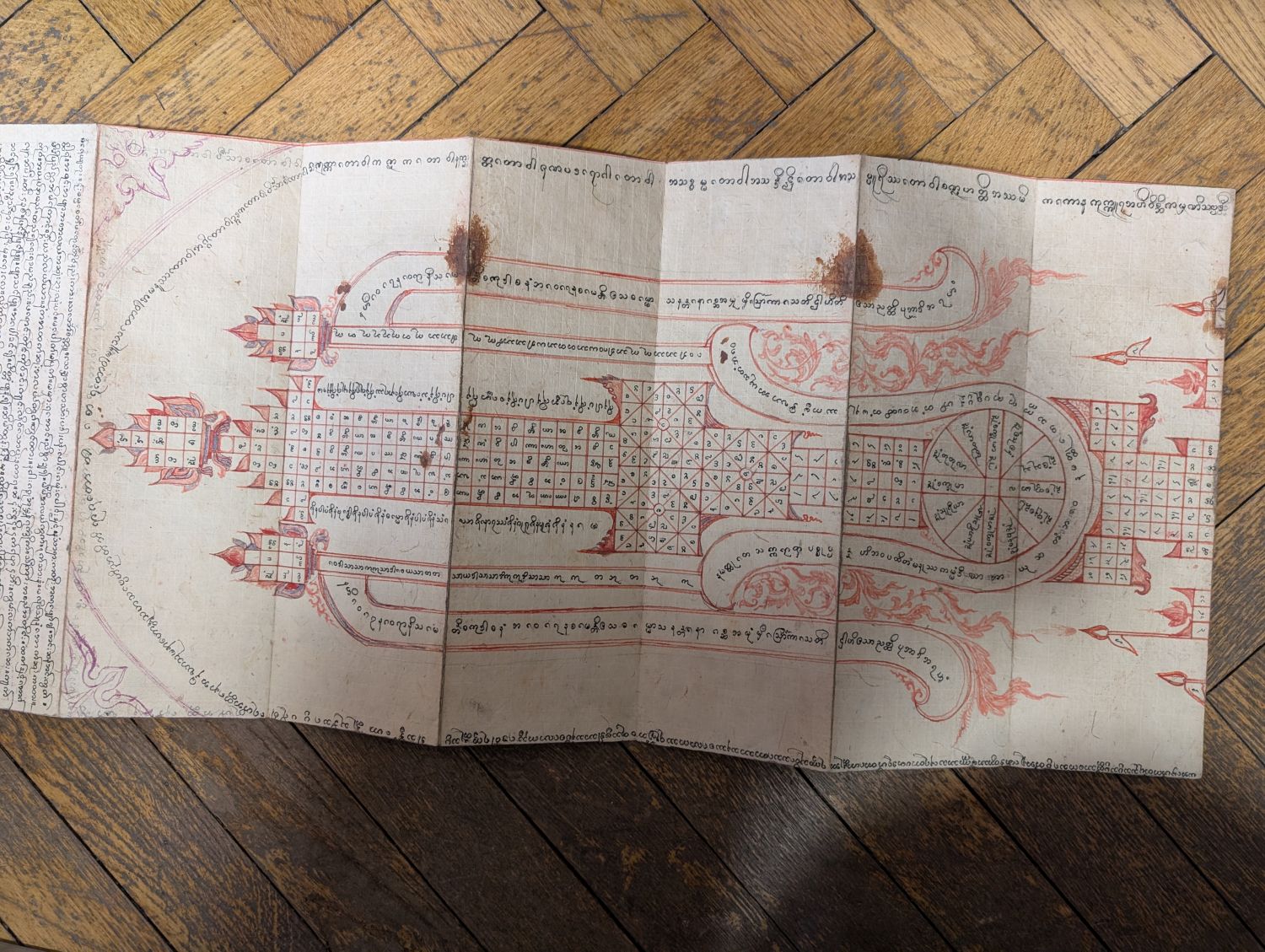 1) Schwarzes Parabaik, wohl ein astronomisches Parabaik. 20 Kompartimente 12 x 37 cm. Ausgefaltet 240 x 37 cm. Birmanische Abugida in Schwarz, Rot und Violett. Mit figurativen und geometrischen Tabellen, Zeichnungen in Feder, mit Rot und grauem Bleistift gehöht, Kämpfer und Tierkreiszeichen darstellend. Schwarz-dunkelbraune Khoi-Deckel.