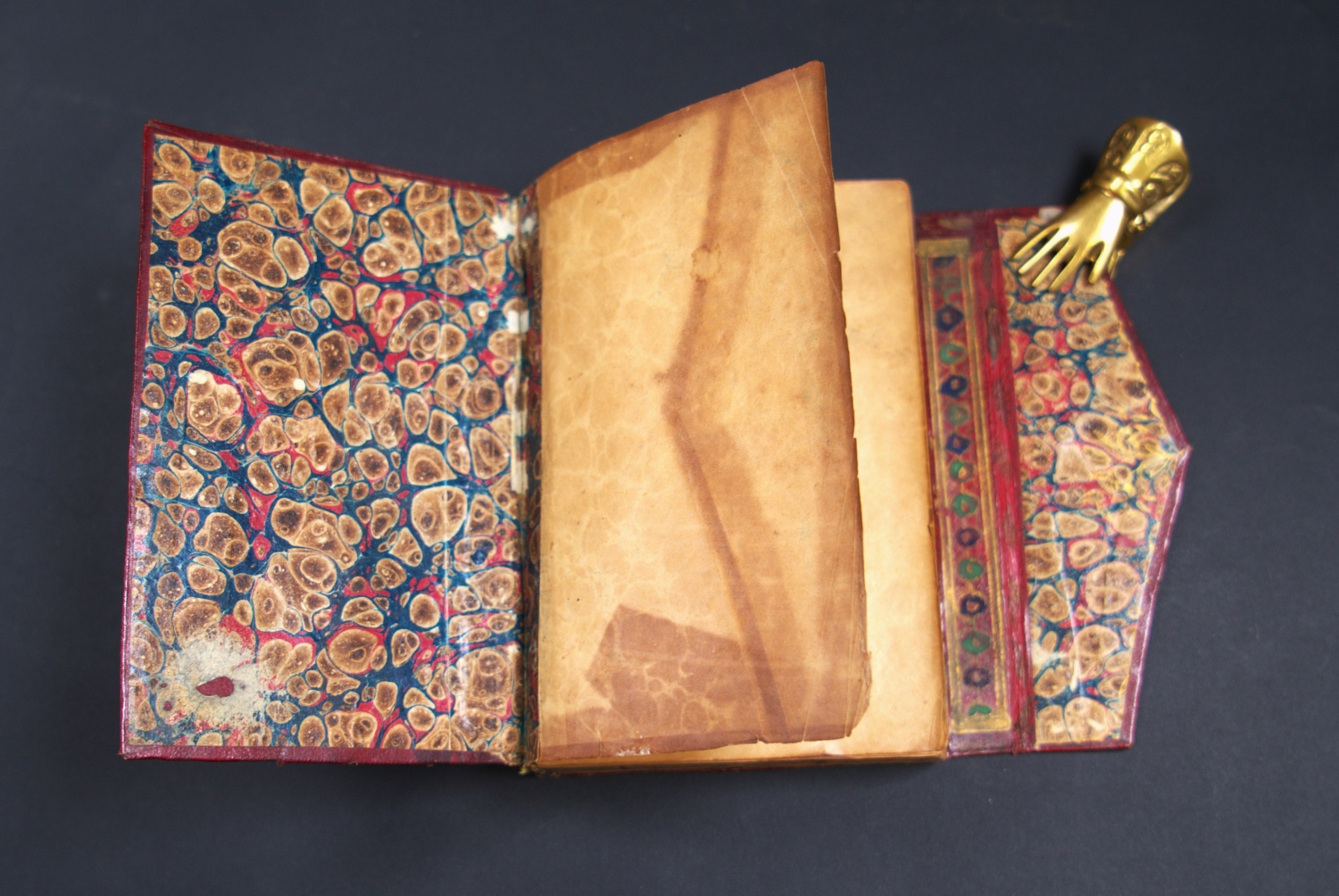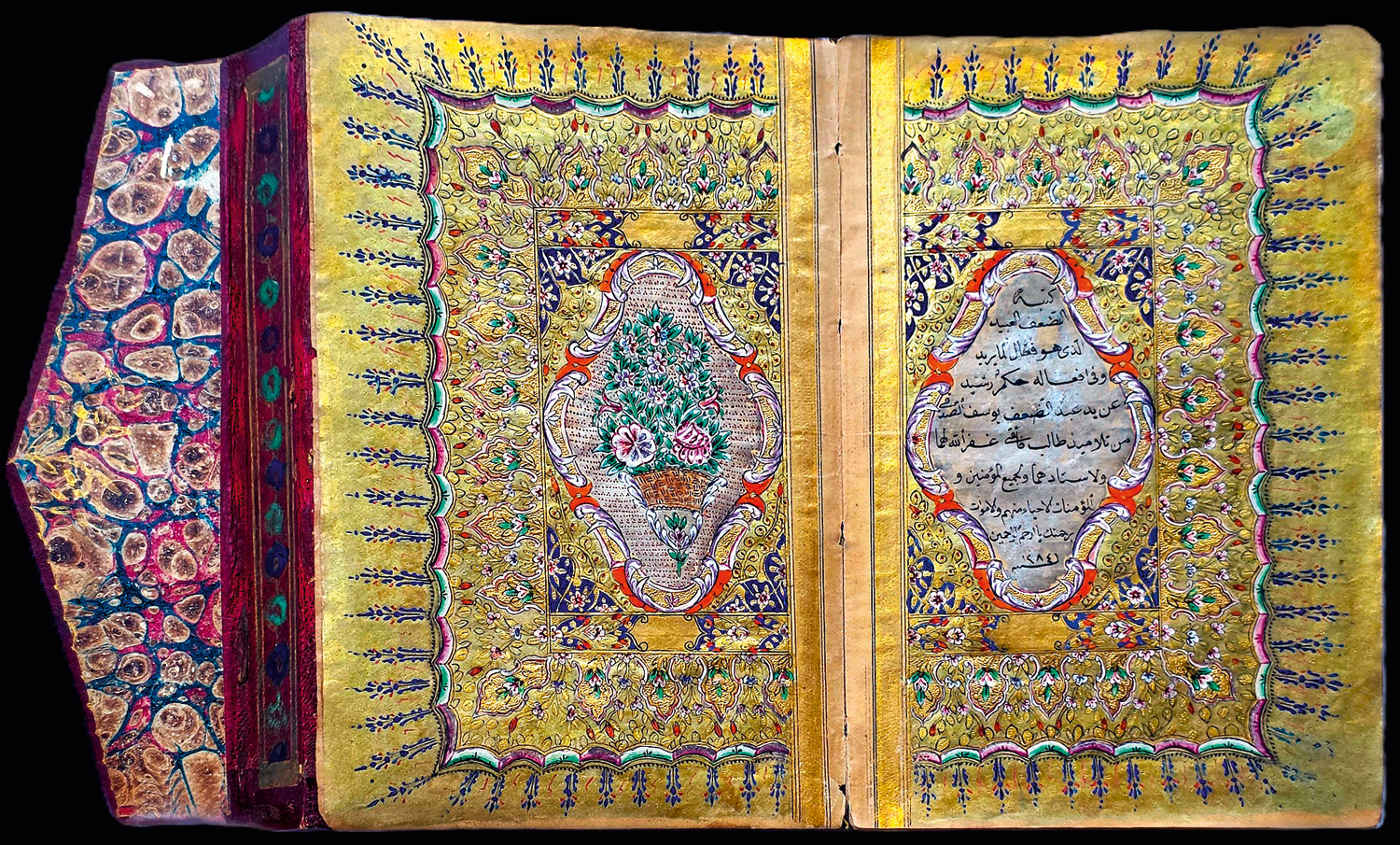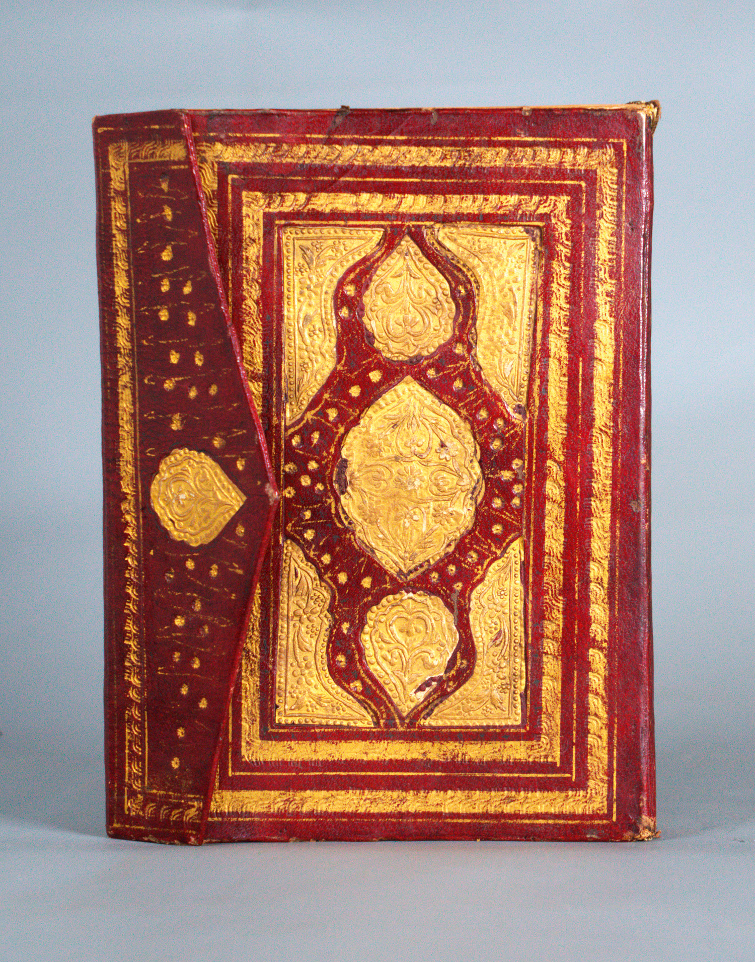 Die aufwendige Goldprägung des Einbandes folgt dem traditionellen Muster mit zwei Riefelbordüren (Zencirek) in Goldfiletenrahmen, zentraler, leicht mandelförmiger "Sonne" (Shemse), den Sonnenanhängern (Salbek) und den vier geschwungenen, reich mit floralen Binnenmustern gefüllten Eckstücken (Köshebent). Die Klappe (Mikleb) schützt die mit bunten und goldenen Blumen geschmückte Schnittkante, sie ist mit einer weiteren Shemse geschmückt. Die Innenklappe und Deckel sind mit buntem Marmorpapier ausgestattet, die Schnittschutzklappe mit bunten Blumen bemalt. – Nicht kollationiert, augenscheinlich komplett. Von bemerkenswerter guter Erhaltung, kaum Farbabrieb, kaum Abrieb der Vergoldung, kaum sichtbare Fingerfleckchen, wenige nicht ins Gewicht fallenende minimale Farbwischer. Insgesamt hervorragend erhaltenes Repräsentationsexemplar im Originaleinband.