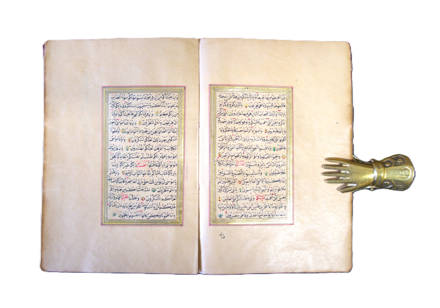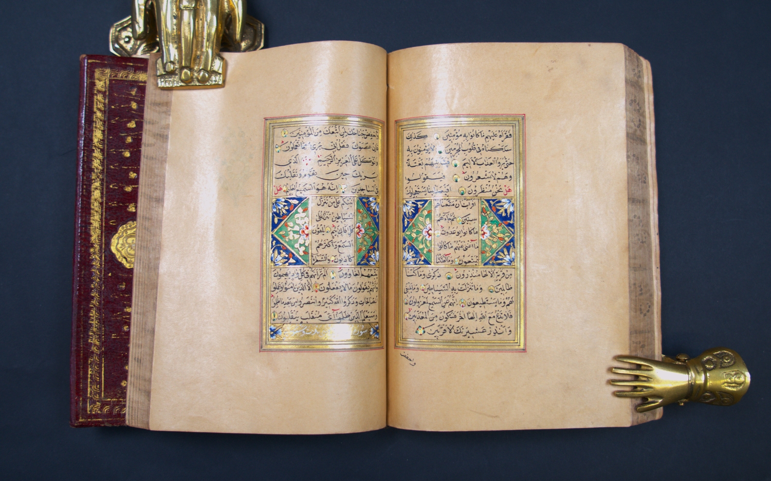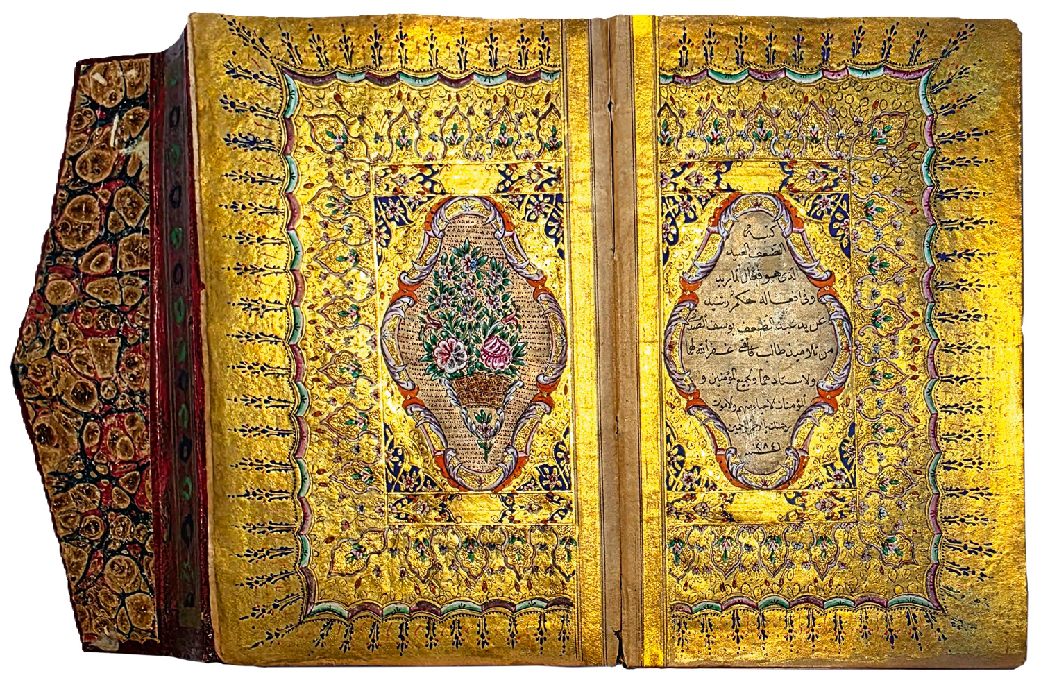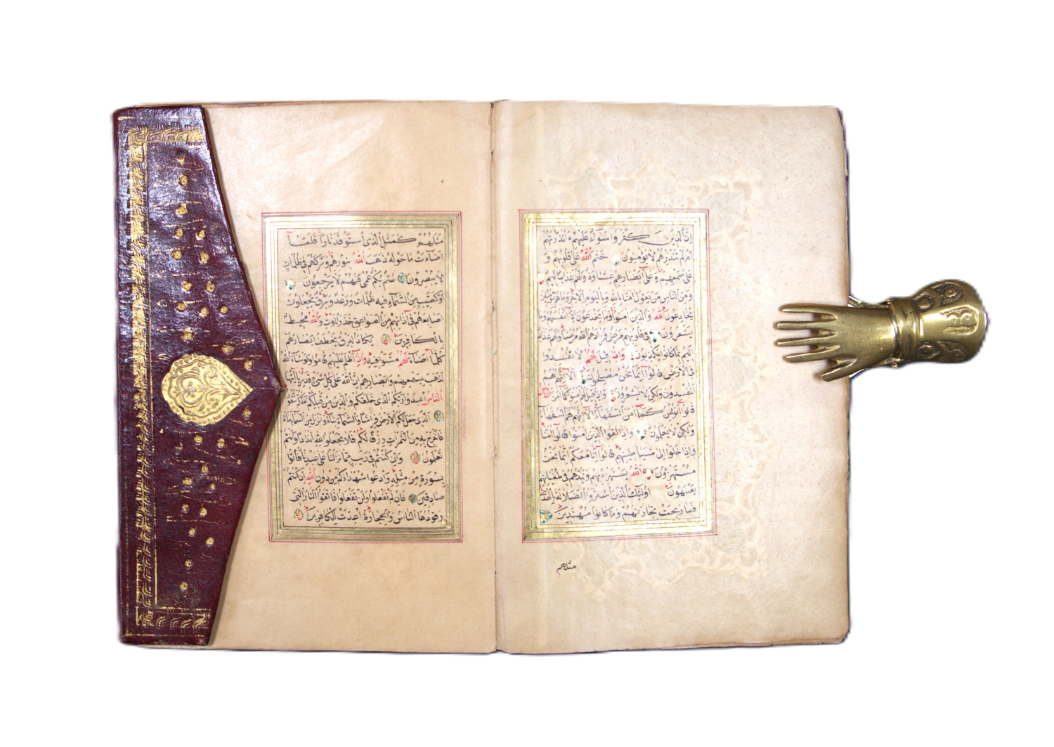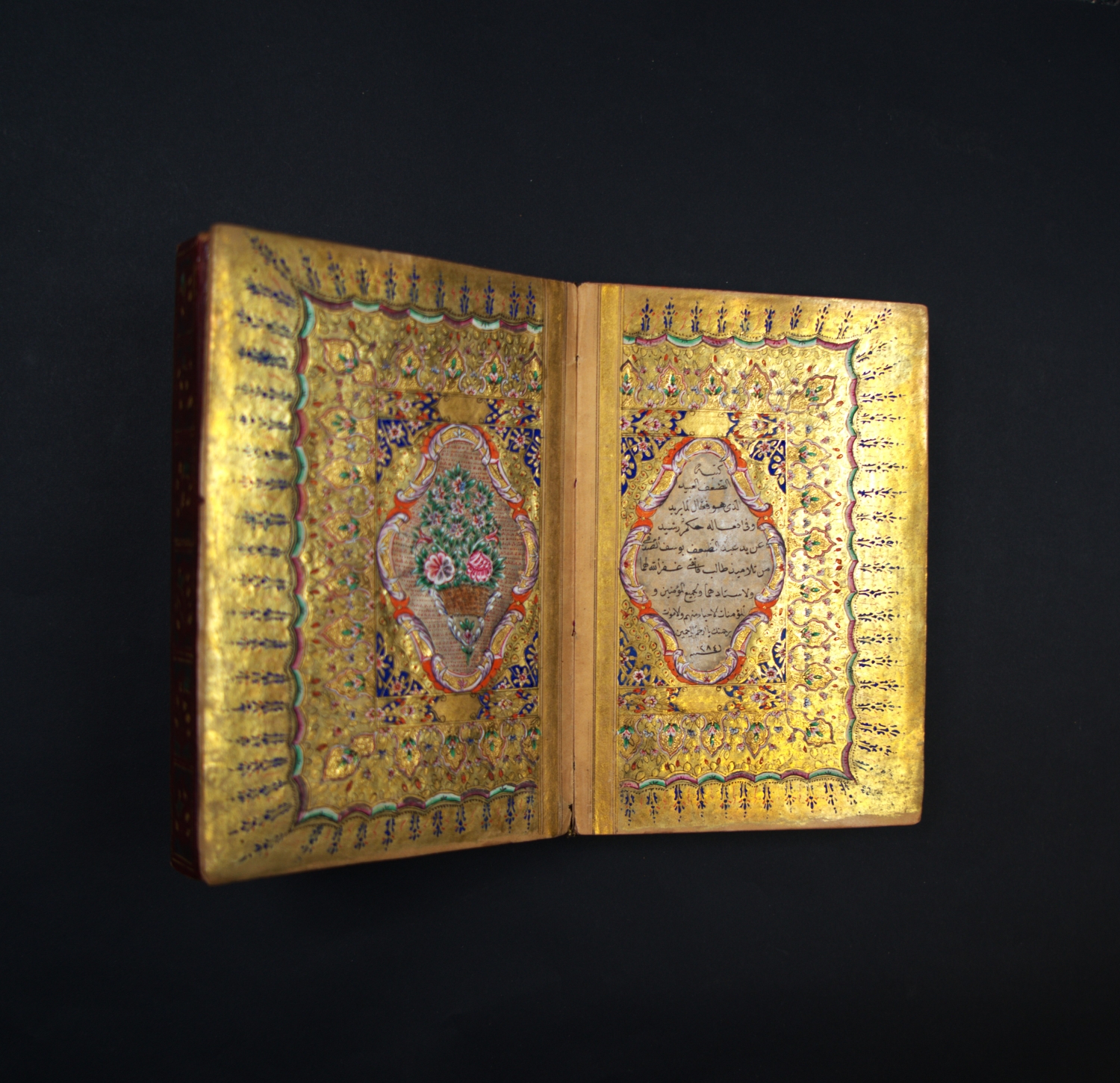Überaus reich geschmückter Goldkoran in seinem originalen, ebenfalls reich verzierten Klappenband mit drei goldüberzogenen, Doppelzierseiten mit Ornamenten in teils punziertem Gold und Farben, in Indigoblau, in Karmesinrot, in Grün, in Orange und Violett, teils mit Weißhöhungen und -verläufen, datiert auf das Jahr "1284" Anno Hegirae, nach der Hidschra. Die Handschrift beginn mit einer besonders feinen, auf flächigem Goldgrund mit reicher Farbigkeit und Ornamentik geschmückten Doppelzierseite (Serlevha), auf der in feinster schwarzer Miniaturschrift im Nastaliq-Duktus die erste Sure (al-Fatiha) und der Anfang der zweiten Sure (al-Baqara) in je einer Kartusche stehen, die mit zahlreichen bunten Blumen umgeben sind. Um den mit viel blau und roten Palmetten verzierten Kasten ist eine breite Bordüre mit zehn Schildern gelegt, die wiederum mit entzückenden bunten Blumen bemalt sind. Blaue und rote Zinnen strahlen radial von der Bordüre aus.