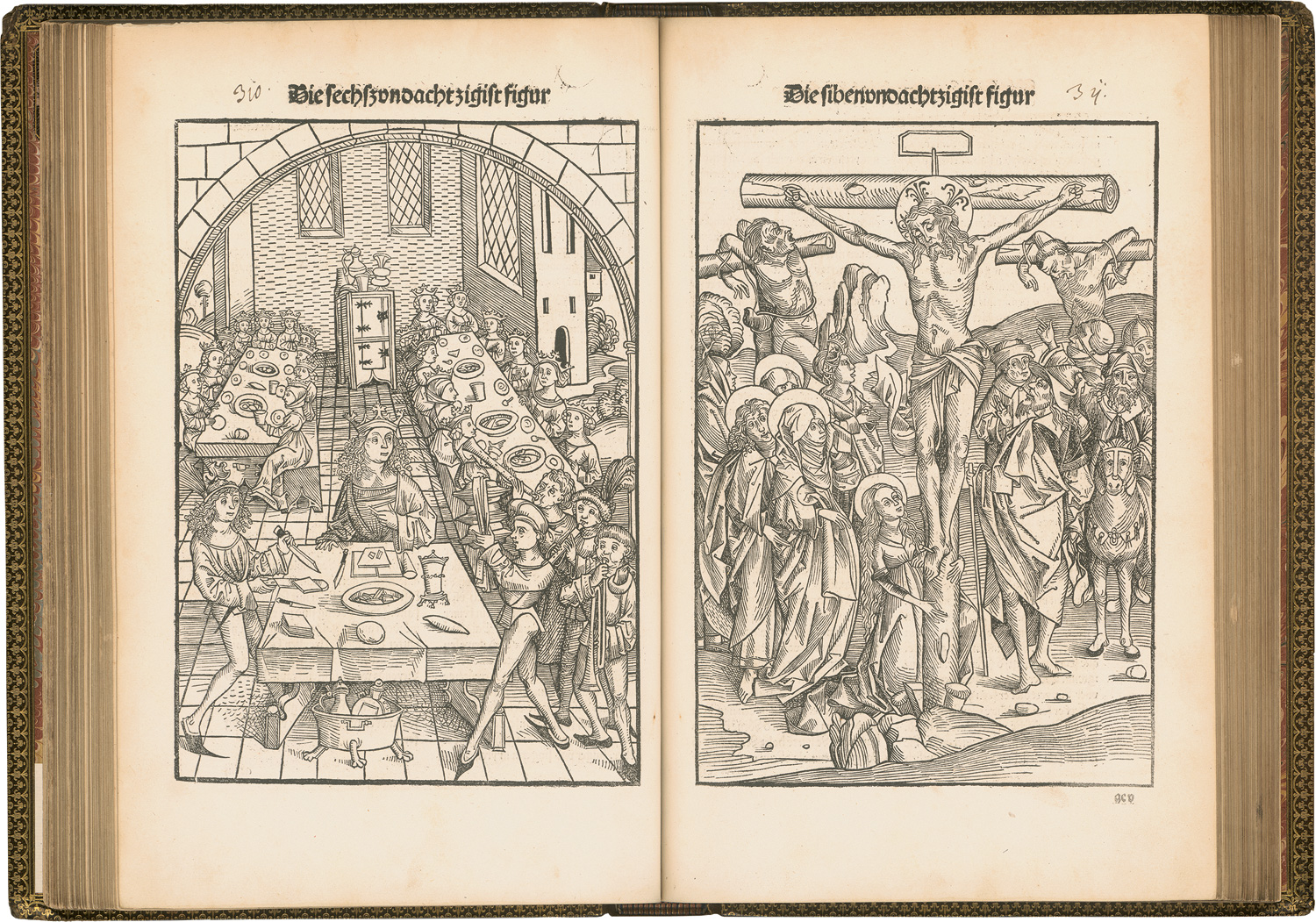 Neben der szenischen Bedeutung der Illustrationen verdienen die Holzschnitte besondere Aufmerksamkeit wegen ihres unendlichen Detailreichtums bei der Darstellung von Kostümen, Waffen, Interieur, Landschaftsveduten, Sitten und Gebräuchen bis hin zu den Verkehrsmitteln im 15. Jahrhundert. – Kapitalspatien leer mit Hilfslettern, einige zeitgenössische und wenige spätere Marginalien in sepiafarbener Tinte sowie saubere Nummerierung, ein verblasster Eintrag auf aii, ganz vereinzelte Bräunungen oder Fleckchen (k6 l1-2) nahezu ohne Feuchtigkeitsspuren oder Fingerflecke oder Randläsuren, nahezu durchgehend außergewöhnlich frisch und sauber und in allerbester Erhaltung. Da unterschiedliche Papierchargen benutzt wurden, weicht die Schöpflinienbreite teils ab. Besonders bemerkenswert bei dem Druck ist nicht zuletzt die hohe Papierqualität, die bei verhältnismäßig dünnen Blättern dennoch weder bei Text noch Holzschnitten, kaum Durchschlag von den Versoseiten zeigen. Die Holzschnitte sind bis auf ganz wenige Ausnahmen fast durchgehend in kontrastreichem, kraftvollen und scharfem, gratigen Abdruck. Sie bilden bis heute ein interessantes Spektrum der spätmittelalterlichen Lebenswelt - ein nahezu unerschöpfliches Studienmaterial für die zeitgenössische Architektur, die Innenausstattung, das Meublement, die Mode bis hin zu den zahlreichen dargestellten Akzessoirs.