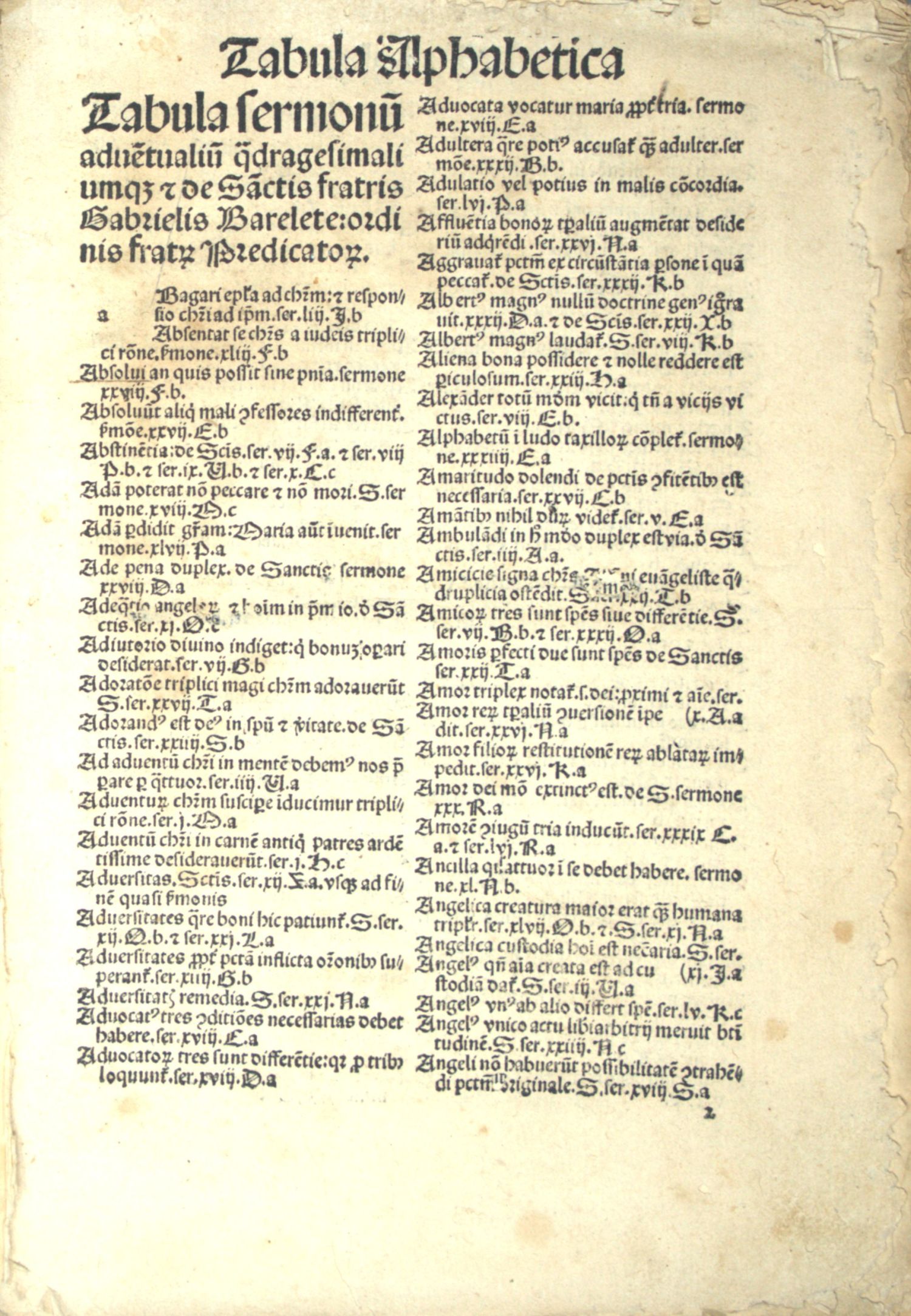 VD16 G 8. – Frühe Ausgabe der im 16. Jahrhundert weit verbreiteten Fastenpredigten des berühmten italienischen Geistlichen Gabriele da Barletta (gest. nach 1480). – Die ersten beiden Textblatt ("Registrum Sermonum" und "Animadverte diligens") fehlen. Teils stärker mit Randläsuren, feuchtrandig, mit hs. Notizen im Text. Sehr selten.