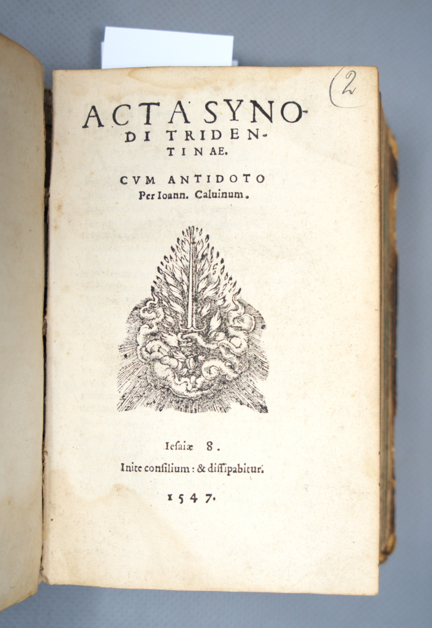 II. Joannes Calvin. Acta Synodi Tridentinae. Cum antidoto. 288 S. (Genf, J. Gérard), 1547. - Nicht bei Adams. I. A. 129.791. Schottenloher 43209e. Erichson 7. - Erste, äußerst seltene Ausgabe. "Ueber dem an Heftigkeit zunehmenden Streit (in Genf) war Calvins Blick trotzdem unverwandt auf die schicksalsschweren Ereignisse des Jahres 1547 in Deutschland gerichtet. Wachsam die Gegenbewegung der röm. Kirche verfolgend, versah er die Akten der abgeschlossenen ersten Sessionsperiode des Tridentinums wieder mit einem wirksamen 'Gegengift'" (K. Barth).
