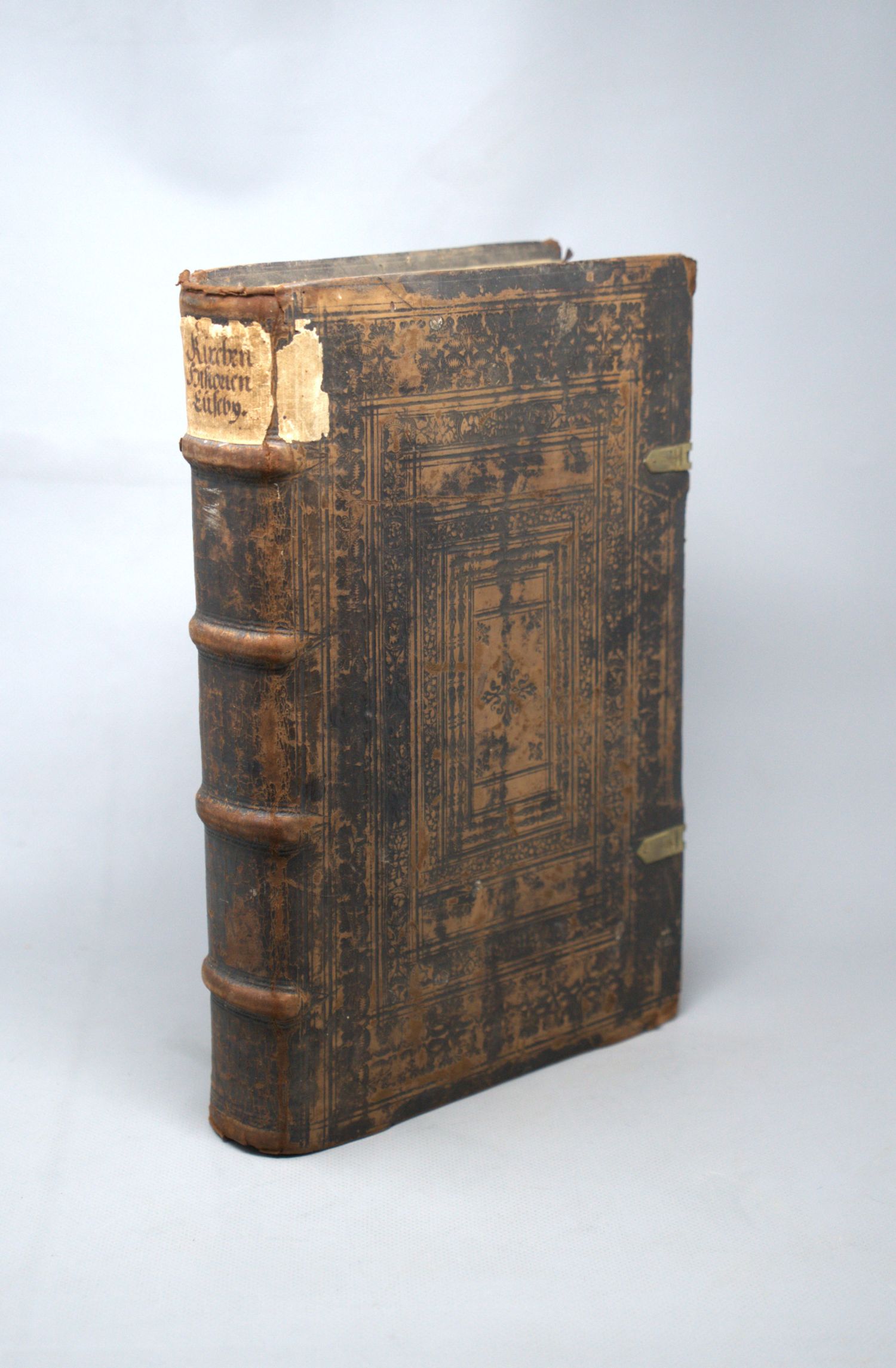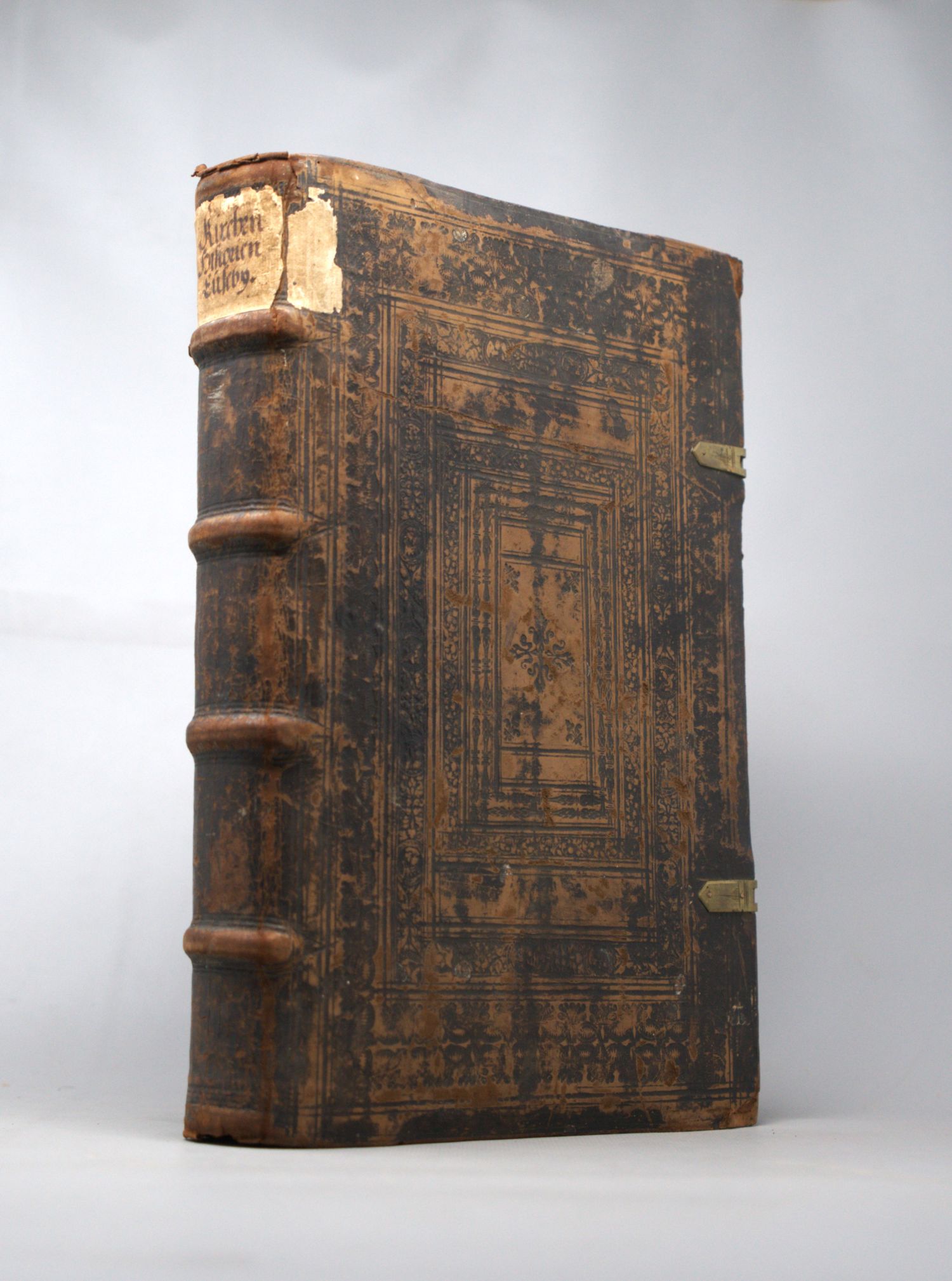 Hedio, Caspar. Chronica, das ist: Warhafftige Beschreibunge aller alten christlichen Kirchen, zum ersten die Historia Ecclesiastica, Eusebij Pamphili Cesariensis eilff Bücher. 16 Bl., DCLXXIX. Mit Holzschnitt-Vignette auf dem Titel und Druckermarke am Schluss. Titel in Schwarz und Rot. 32,5 x 20,5 cm. Blindgeprägtes Leder d. Z. (berieben, bestoßen und mit kleinen Fehlstellen) mit hs. RSchild und zwei Messingschließen. Basel, Sebastian Henricpetri, 1593.