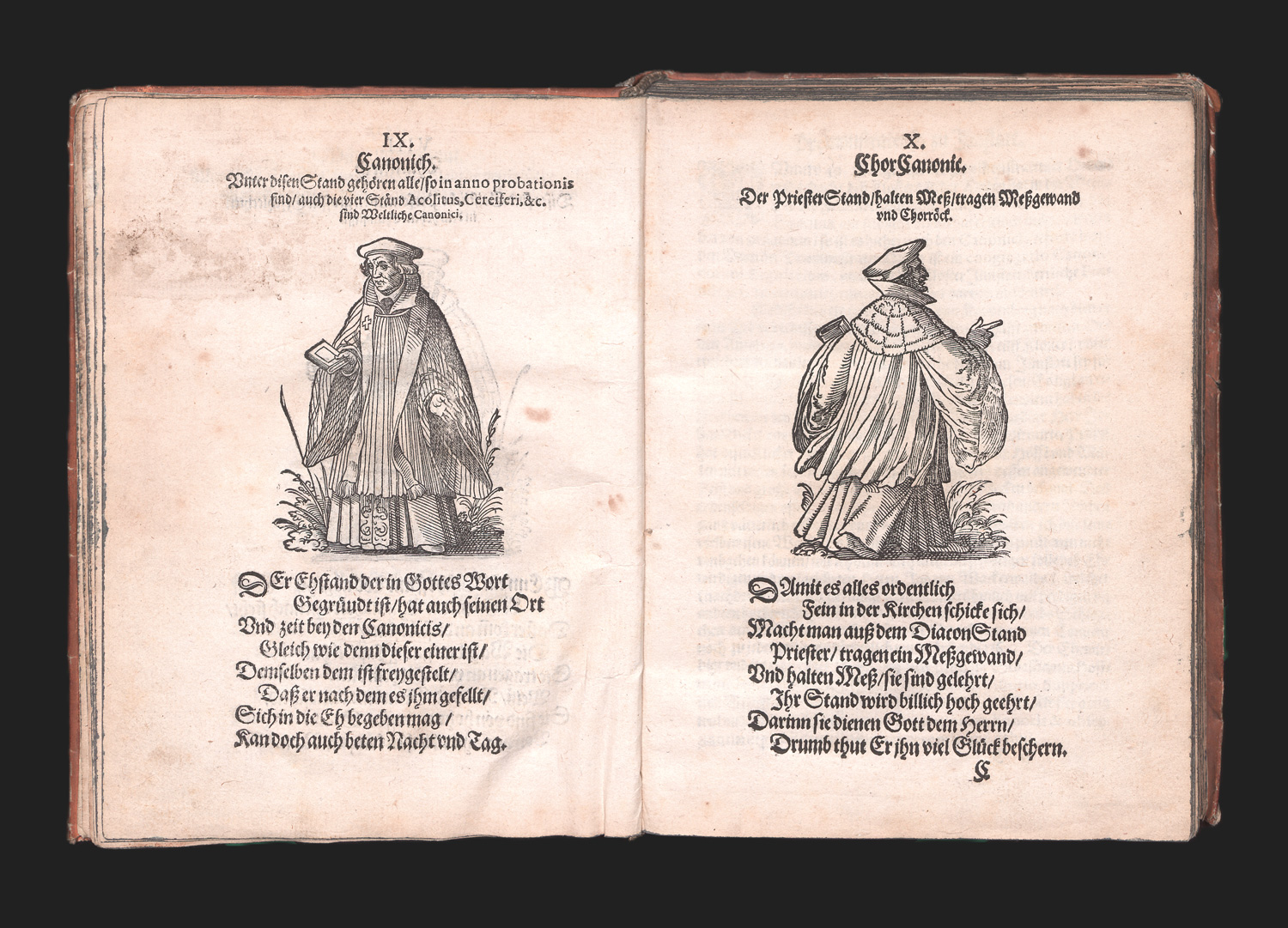 VD16 L 2461 (hier mit Datumsangabe "MDLXXXV"). Becker 40a. Holstein II, S. 48. STC 524. Lipperheide 1851 (Oe 1). – Erste deutsche Ausgabe, erschien parallel mit der lateinischen Erstausgabe. Die schönen Holzschnitte von Jost Amman zeigen die geistlichen Würdenträger verschiedener Rangstufen in ganzer Figur, darunter auch einige Ordensfrauen. Oberhalb der Darstellung eine kurze Beschreibung des Ordens und der Tracht, darunter jeweils acht Verse im Paarreim. – Etwas fleckig, Titel und erste Blatt mit einigen hinterlegten bzw. geschlossenen Rissen und kleineren Fehlstellen (etwas Textverlust), mehrere Lagen mittig auch mit Feuchtigkeitsrand.