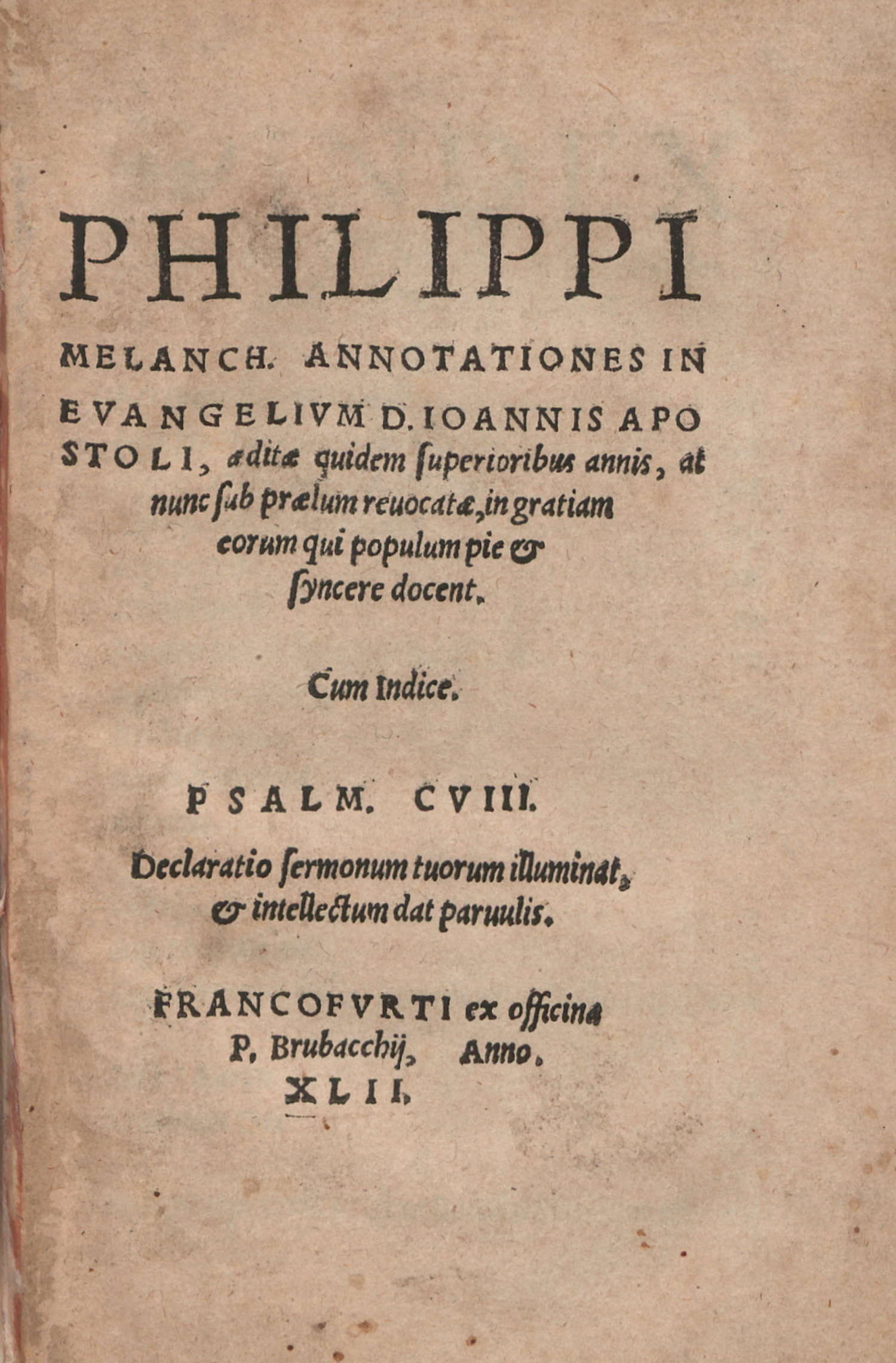VD16 M 2484. – Letzte lateinische Ausgabe von Melanchthons Kommentar zum Johannesevangelium, der Erstdruck erschien 1523 bei Cratander in Basel. – Etwas fleckig, am Schluss auch mit Feuchtigkeitsrand. Block stärker verschoben.