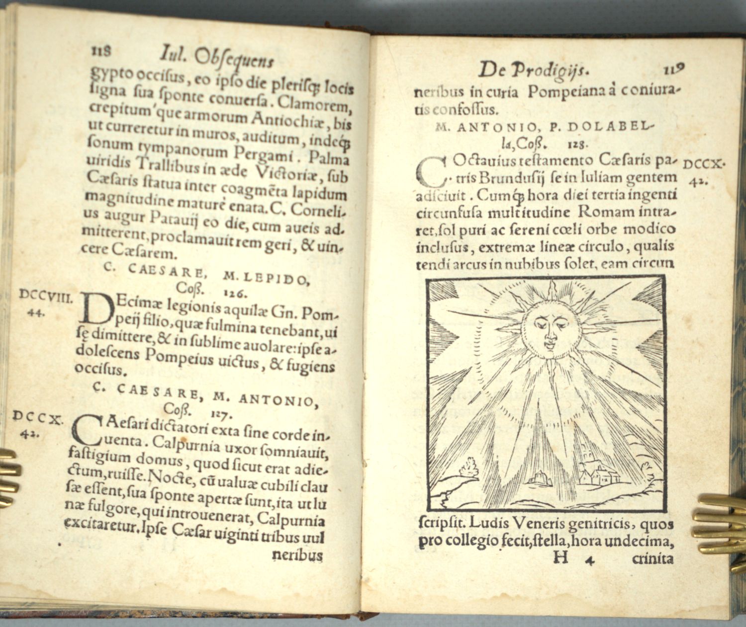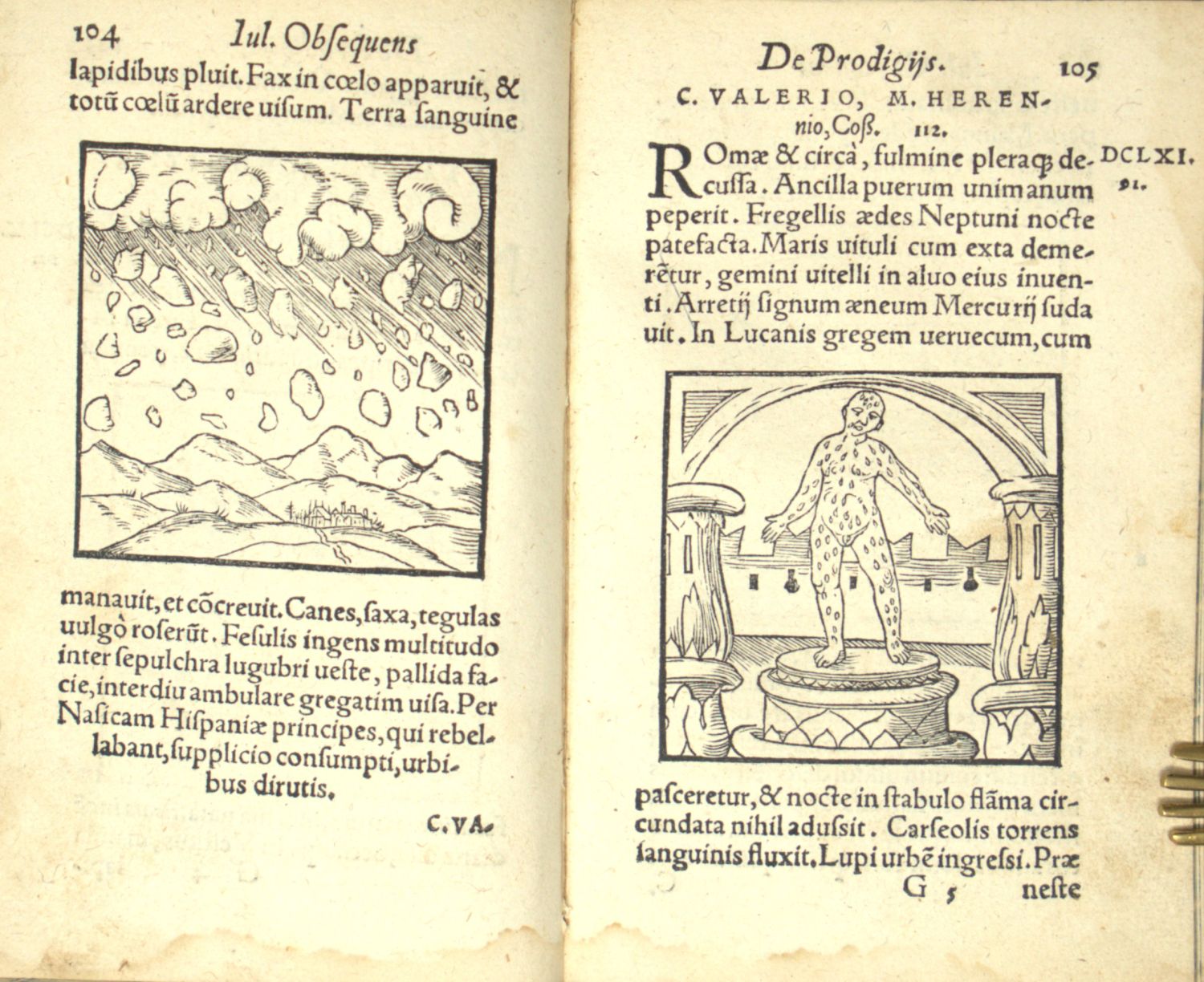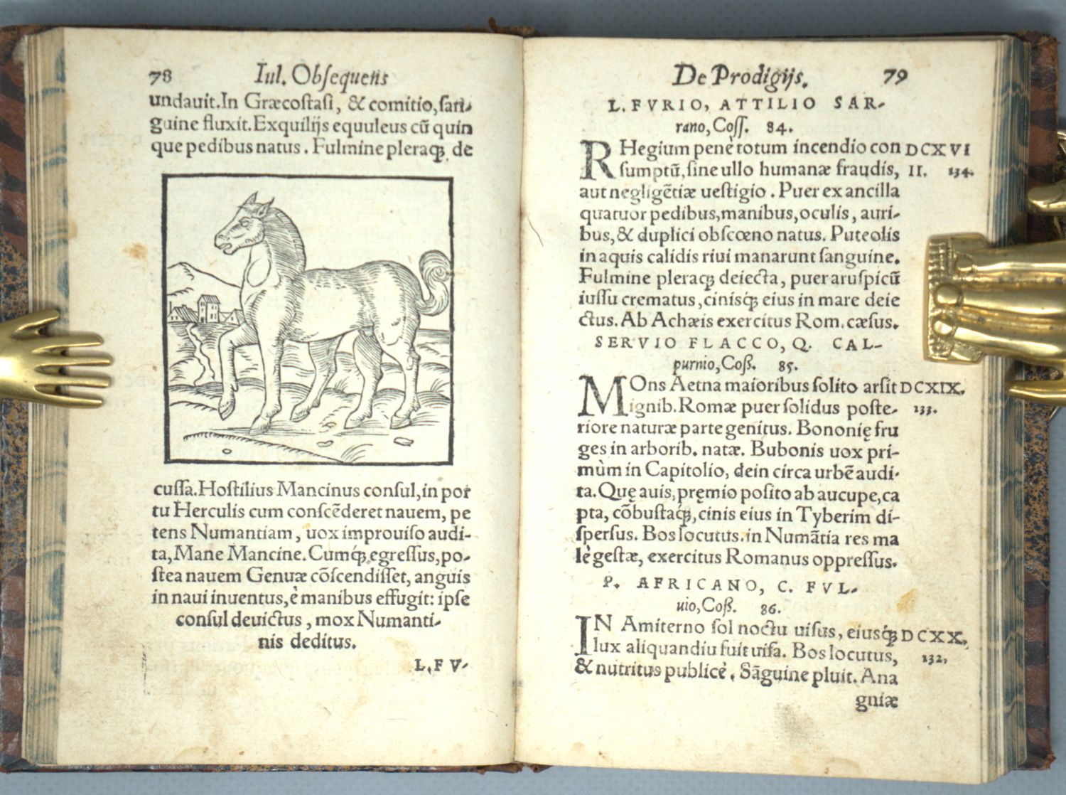 Obsequens, Iulius. Prodigorum liber... per Conradum Lycosthenem... restitutus. 10 Bl., 327 S., 6 Bl. Mit Holzschnitt-Titelvignette und 82 (teils wiederholten) Holzschnitten im Text . 15,5 x 10 cm. Halbleder d. Z. mit goldgeprägtem RSchild (berieben und bestoßen). Basel, (J. Oporinus, 1552).