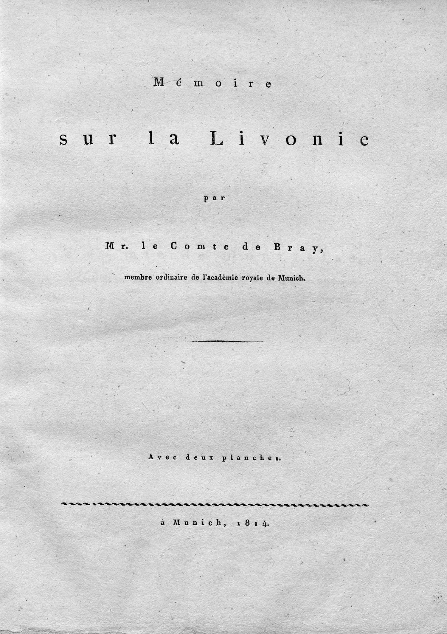 Bray, (François Gabriel von). Mémoire sur la Livonie. 2 Bl., 88 S. Mit 2 kolorierten Kupfertafeln. Marmorierte Broschur d. Z. (schwache Randknicke). München, o. Dr., 1814.