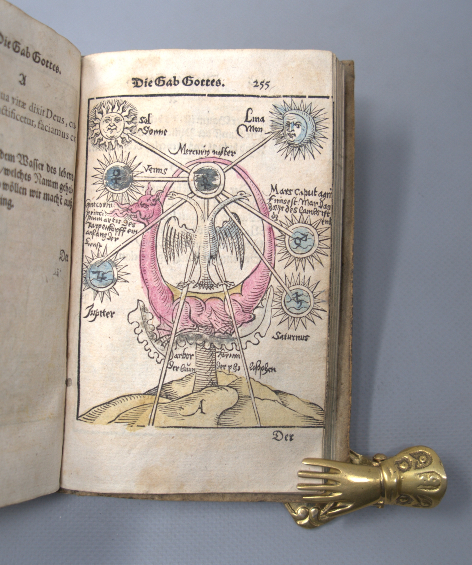 Reusner, Hieronymus (Hrsg.). Pandora, das ist die edelste Gabe Gottes oder der werte und heilsame Stein der Weysen, mit welchem die alten Philosophi, auch Theophrastus Paracelsus, die unvollkommene Metallen durch gewalt des Fewrs verbessert. 8 Bl, 317 S., 1 Bl. Mit 42 (davon 20 blattgroßen) kolorierten Textholzschnitten. 16 x 10 cm. Pergamentband d. Z., die Deckelbezüge unter Verwendung eines Handschriftenblattes aus dem 14. Jahrhundert (mit Fehlstelle am Rücken). mit hs. RSchild. Basel, Sebastian Henricpetri, (1588).
