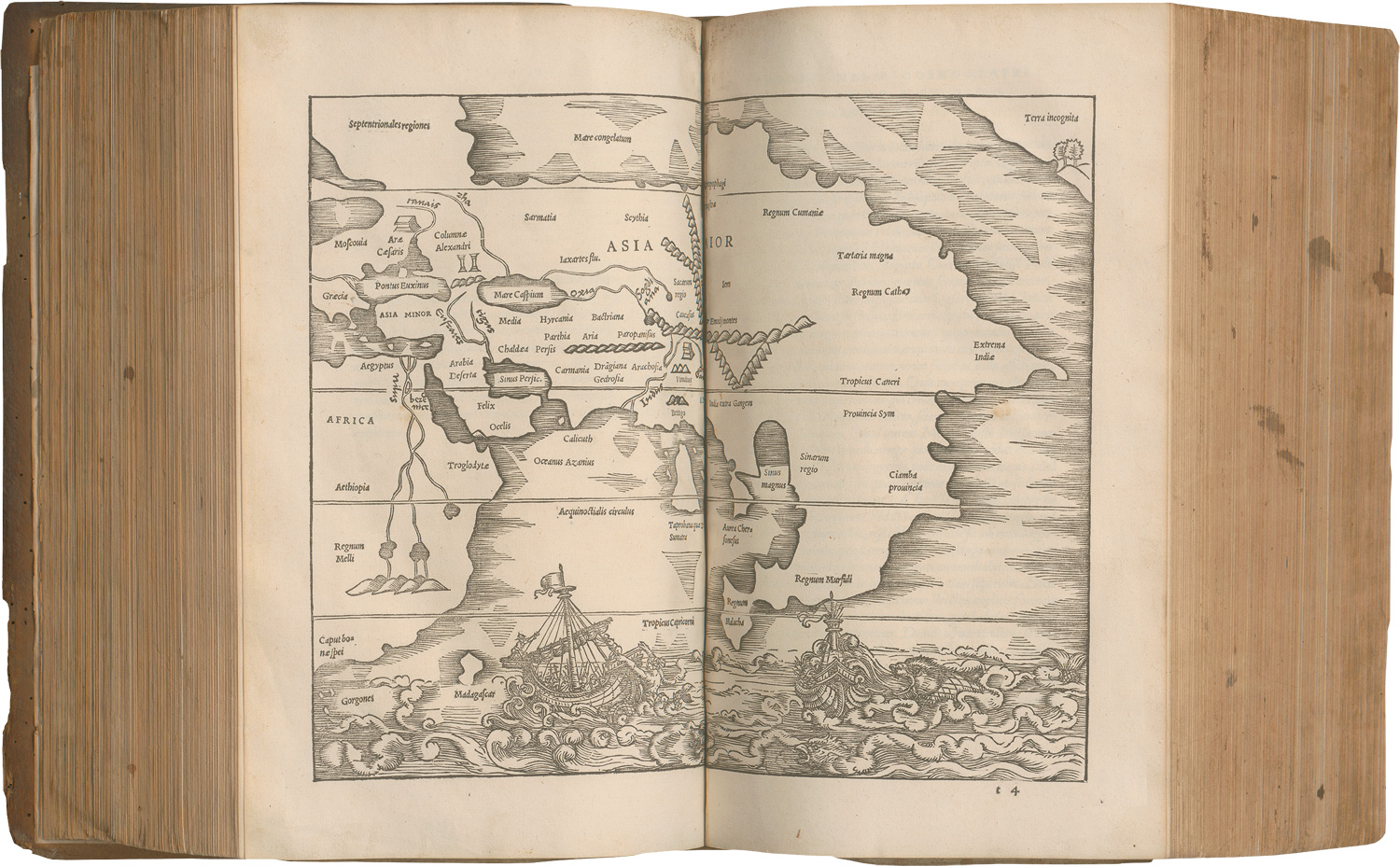 Besonders bemerkenswert ist die hübsche Holzschnittkarte, die den Mittelmeerraum mit zwei Schiffsstaffagen zeigt. – Mit Exlibris auf dem Vorsatz. Erster Titel mit hs. Besitzvermerken und etwas gebräunt. Insgesamt mit Wurmlöchern, knickspurig und vereinzelt leicht fleckig.