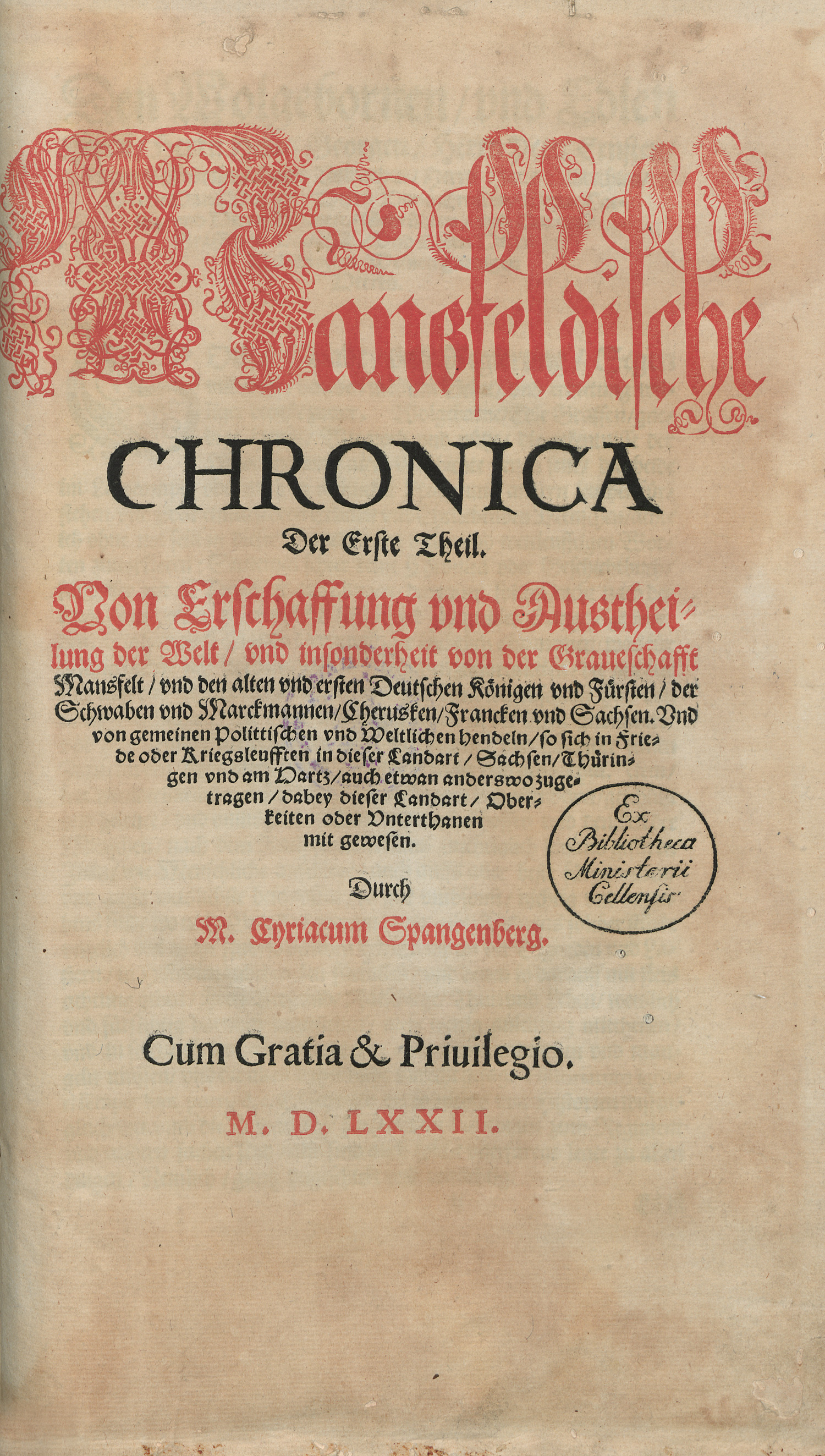 VD16 S 7635. Goedeke II, 194, 95a. – Erste Ausgabe dieser "tüchtigen Leistung" (ADB) des Historikers Cyriacus Spangenberg (1528-1604), Schüler von Luther und Melanchthon. Von der in "zeittypisch kompilatorischem Charakter" (Killy) erstellten Chronik ist nur der vorliegende Teil im 16. Jahrhundert erschienen: "Cette chronique, qui va jusqu'à l'année 1571, n'a pas été continuée. Elle a reparu sous un nouveau titre portant 'Sächsische Chronica' Francfort 1576." (Brunet VI, 457). Die ehemalige Grafschaft Mansfeld im obersächsischen Kreis gewinnt auch durch den ältesten Abbau von Kupfer in Deutschland, wie es im Register detailliert aufgeführt ist, besondere Bedeutung. Aus Briefen Spangenbergs geht hervor, daß die Bände II-IV in Vorbereitung waren. – Ohne die zumeist fehlende Karte, sie "ist scheinbar nur wenigen Exemplaren der Originalausgabe beigefügt worden"(MNE). Titel etwas gebräunt, recto et verso gestempelt sowie mit Wurmspuren im weißen Rand, am Schluss ebenfalls mit Wurmspuren.