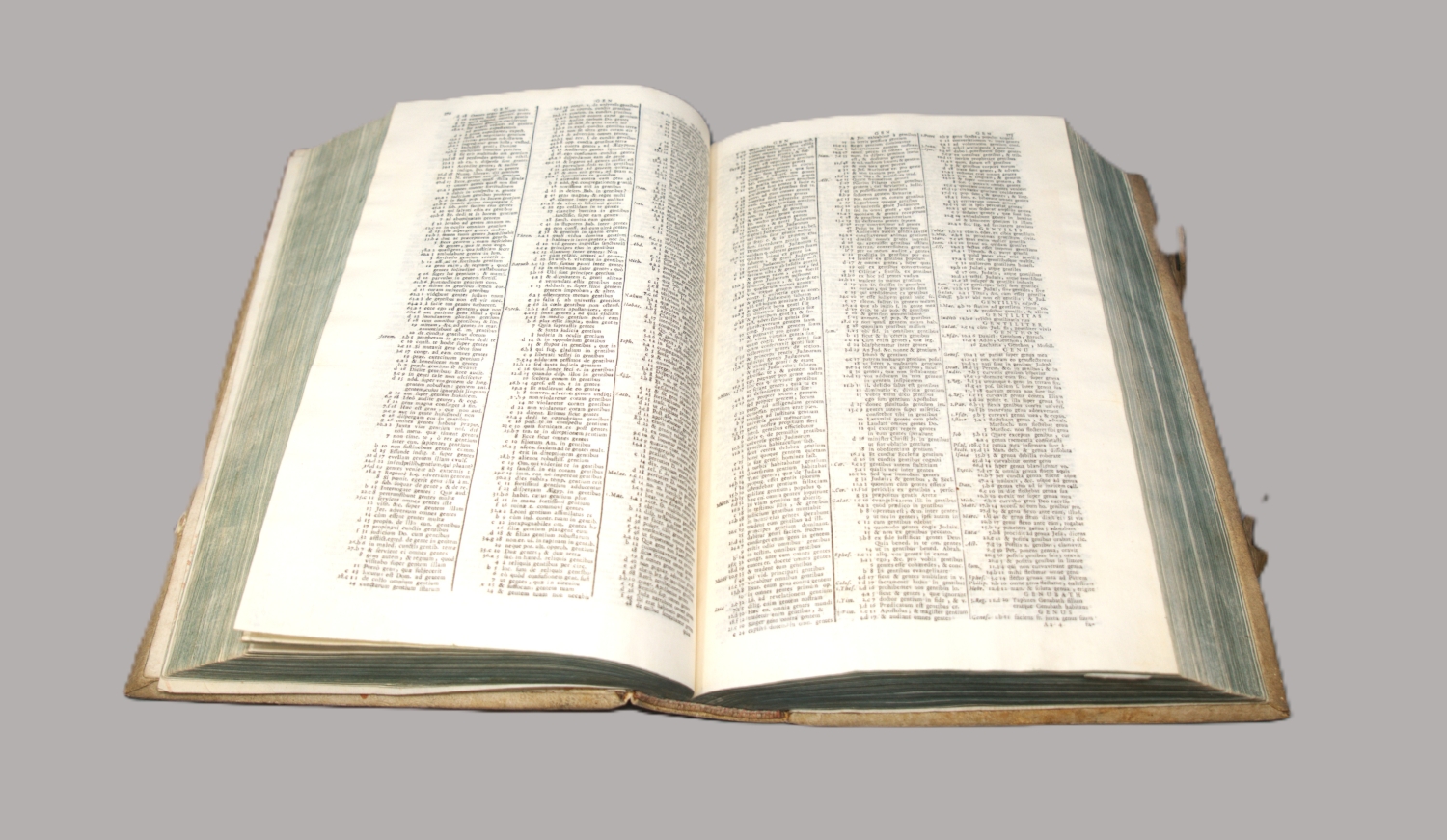 Dreispaltig gedruckte Konkordanz, die auf Hugo de Sancto Caro zurückgeht. "Lucas Franciscus (Britgensis), one or the ablest of the Roman Catholic commentators, was born at Bruges in 1549 ... He also produced a Concordance of the Pidgate, corrected and augmented by Herbert Phalesius and Benedict of Afflighem, Antw. 1606" (Best Edition, Antwerpen 1642). – Vereinzelt etwas stock- und fingerfleckig. Titel mit Bibliotheksstempel "Bibliothek des erzb. Klerikalseminars Freising. Duplum D. d. F." und Vorsatz mit hs. Besitzvermerk "Dr. Gerhard Eis Erworben 21. Januar 1948", mit montiertem Besitzschild.