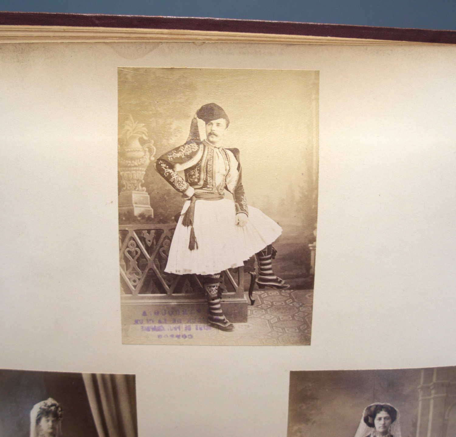 Schönes Souveniralbum mit zwölf größeren Ansichten (Format: ca. 21,5 x 24,5 cm) des Hauptortes Kerkyra und seines Hafens, Schloss Mon Repos auf der Kanoni-Halbinsel, der Siedlung Potamos ("Fotografia B. Rorri"), ferner von der vorgelagerten Insel Pontikonissi, Paliokastro etc. Am Schluss mit drei Darstellungen lokaler Bewohner in der traditionellen Inseltracht, diese im kleineren Format (ca. 13,5 x 9,5 cm). Auf dem fl. Vorsatz aus Seidenmoiree in Golddruck "Weihnachten E. R. 1889" – Die Photos teils etwas berieben.