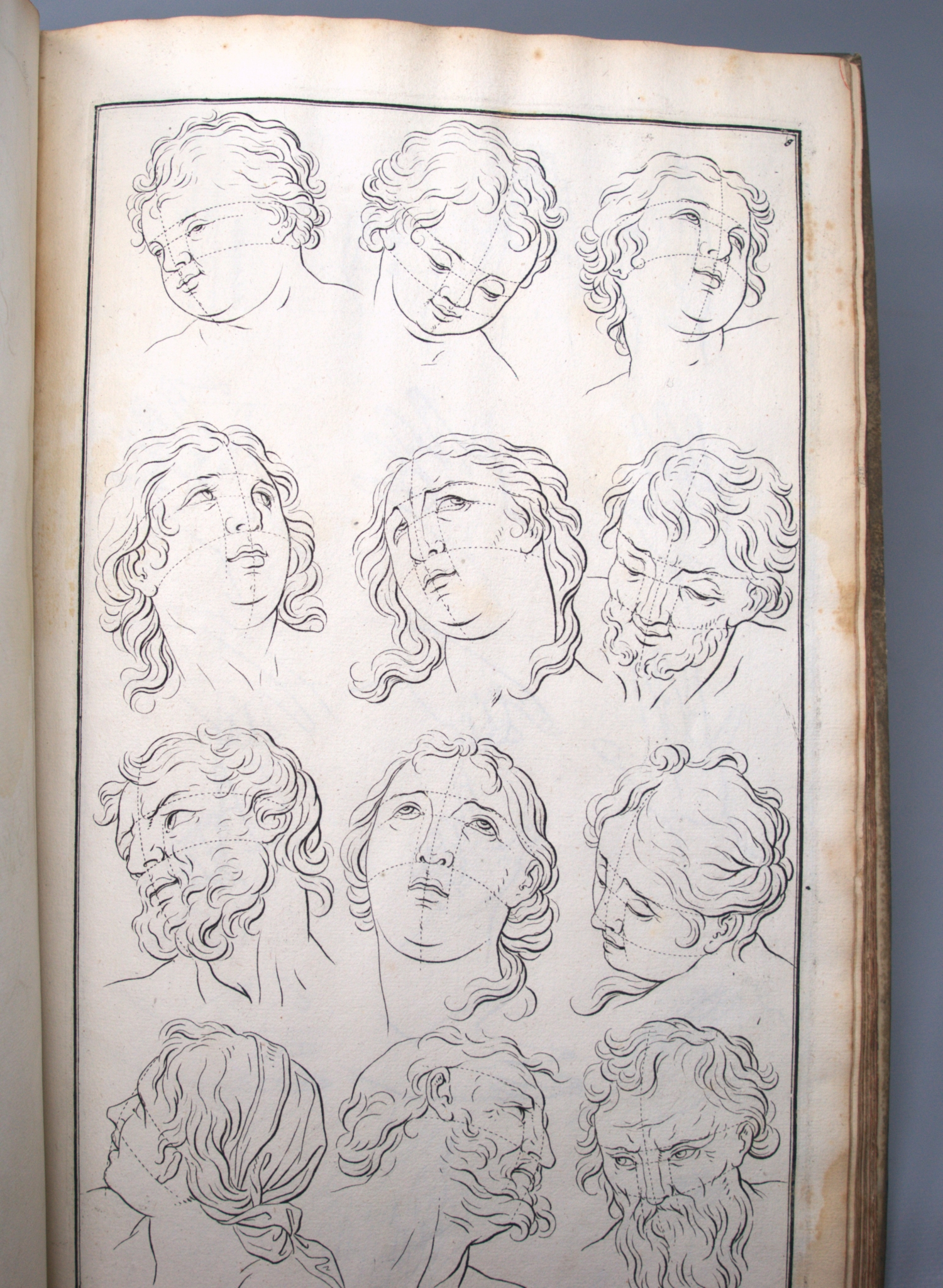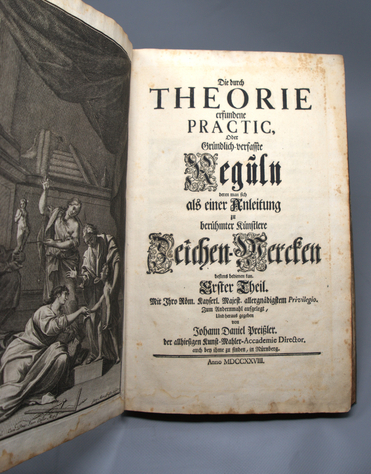 Preissler, Johann Daniel. Die durch Theorie erfundene Practic, oder gründlich-verfasste Reguln deren man sich als Anleitung zu berühmter Künstlere Zeichen-Wercken bestens bedienen kan. Teil I-III in 1 Band. 8 Bl.; 4 Bl.; 4 Bl. Mit gestochenem Frontispiz und 54 Kupfertafeln. 36 x 22 cm. Pergament d. Z. (etwas fleckig, gewellt und mit Kratzspuren) mit RTitel. Nürnberg, Johann Daniel Preissler, 1728-1732.