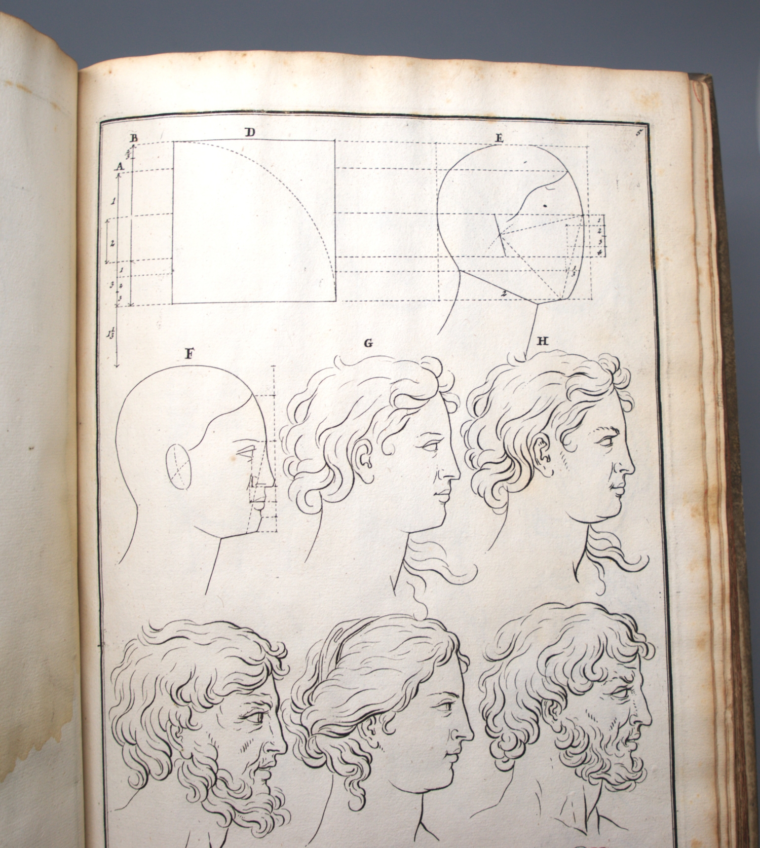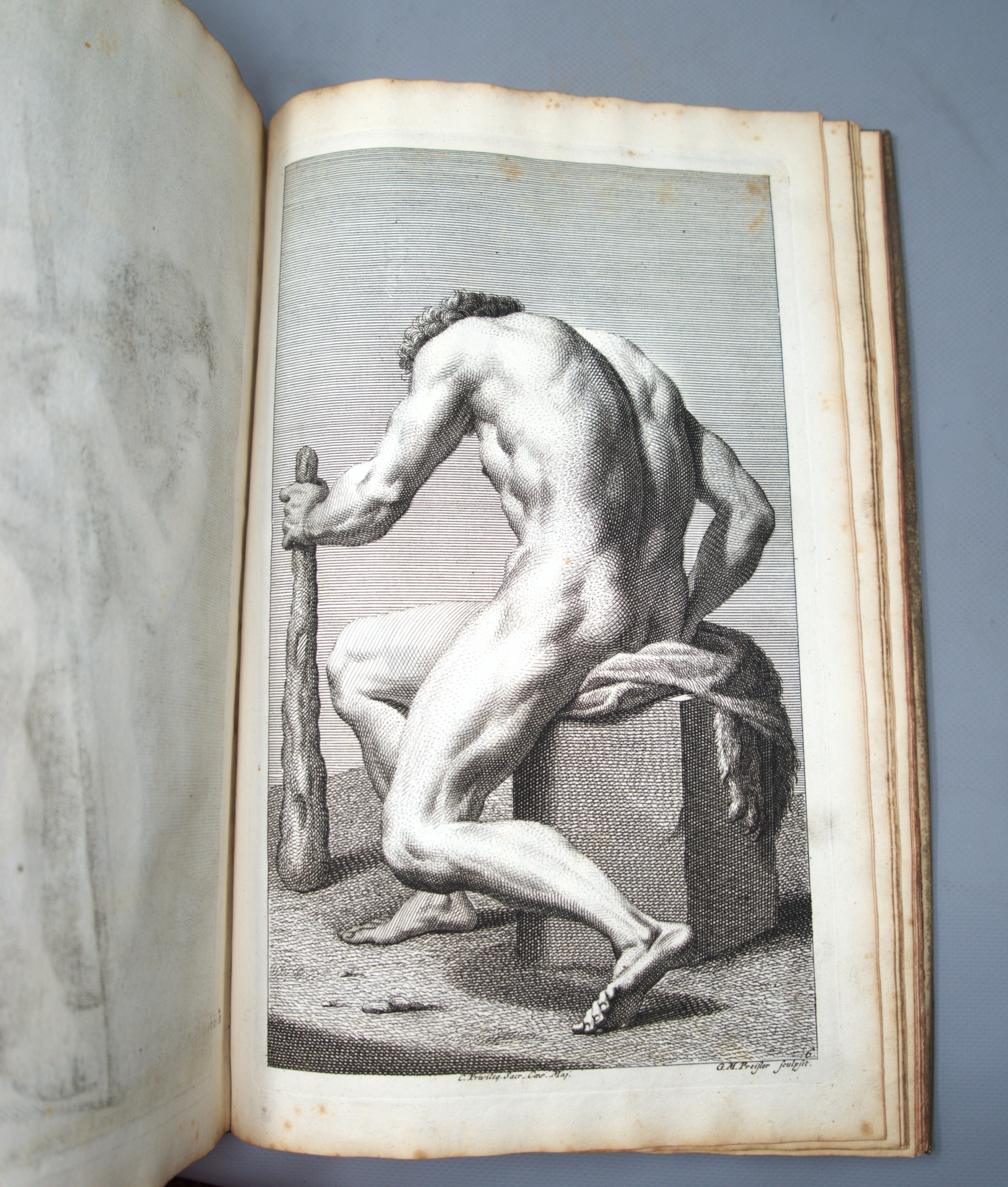 Thieme-Becker XXVII, 373f. Vgl. Berliner Ornamentstichsammlung 4628. – Seltene erste Ausgabe. Lehrbuch für Künstler mit zahlreichen anatomischen Beispieltafeln, in denen die Proportionen des menschlichen Körpers detailliert ausgerechnet und dargestellt werden. Der Autor und Künstler Johann Daniel Preissler (1666-1737) kam aus einer einer böhmischen Glasmacher- und Malerfamilie. Er ging sowohl bei seinem Vater Daniel Preissler als auch bei Johann Murrer in die Lehre und war von 1705 an Direktor der Nürnberger Kunstakademie. – Vorderer und hinterer Innensteg leicht offen. Stock- und fingerfleckig, feuchtrandig und mit kleinen Randeinrissen. – Beigebunden: Carlo Cesi. L'Anatomia dei pittori. Das ist, deutliche Anweisung und gründliche Vorstellung von der Anatomie der Mahler. Andere Auflage. 2 Bl. 16 Kupfertafeln. Nürnberg, Johann Preißler, 1732.