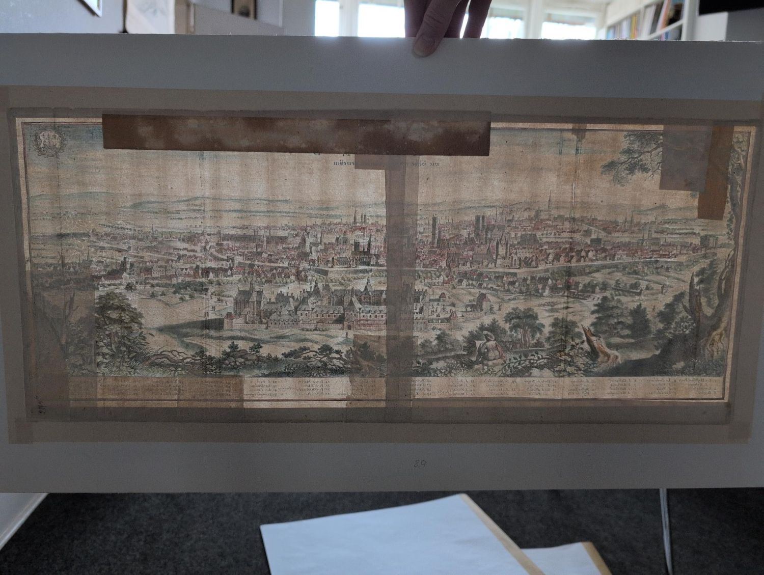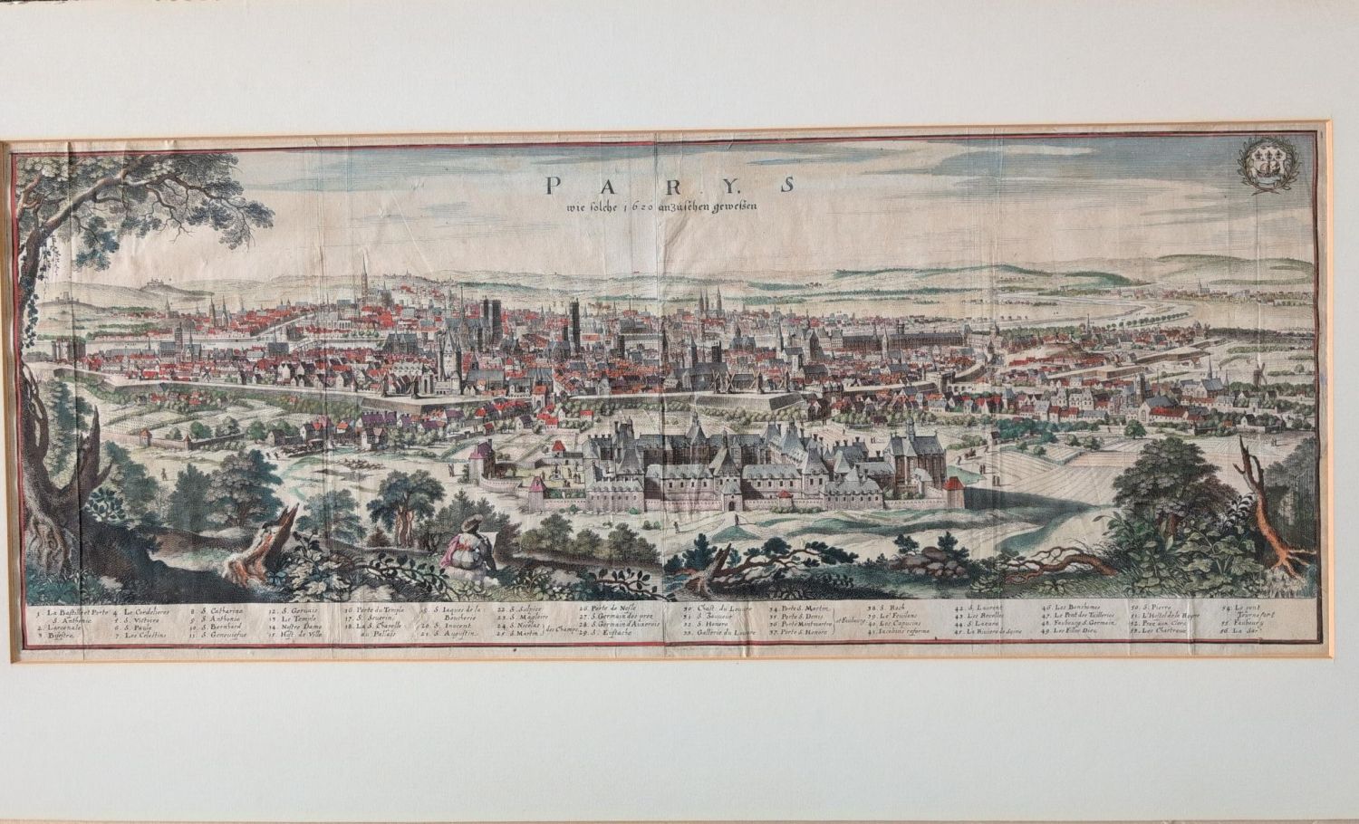 Fauser 10602. – Hübsche Ansicht der Stadt Paris von einer Anhöhe aus von Matthäus Merian (1593-1650). Mit Wappen und Legende. – Mit Mittelfalz, Knapp beschnitten, mit hinterlegten Einrissen. Im schönen Kolorit.