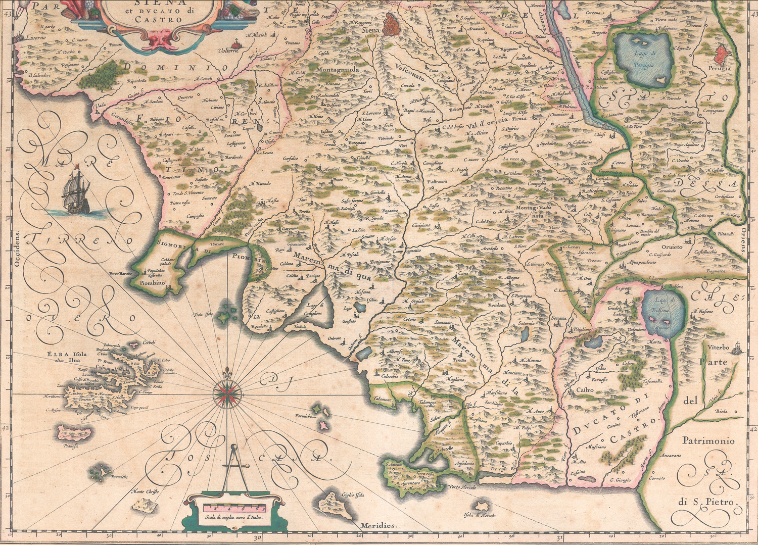 Siena. - Territorio di Siena, con il Ducato di Castro. Grenzkolorierte Kupferstichkarte bei Janssonius, von 2 Platten gedruckt und zusammenmontiert. Mit Titelkartusche und Meilenmesser,Segelschiff und Windrose. Mit Passepartout unter Glas in goldlackierter Holzleiste. 40 x 51,5 cm. Amsterdam, J. Blaeu, um 1635.