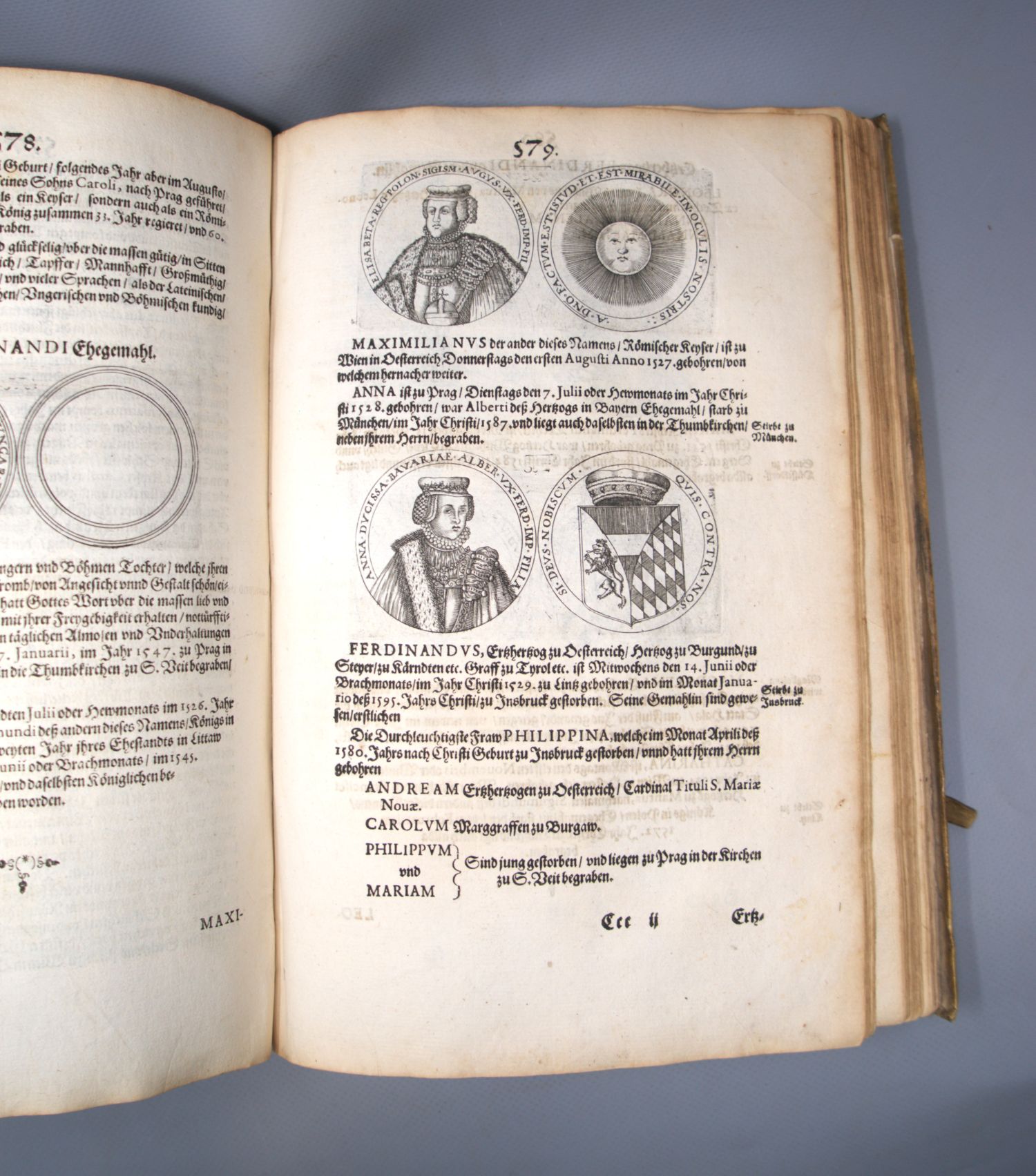 VD17 3:006462K. – Zweite deutsche Ausgabe der zuerst 1615 auf Latein erschienenen Chronik. Der erste deutsche Druck erschien 1618 unter dem Titel Aller Römischer Keyser Leben und Thaten ebenfalls in Frankfurt bei Paul Jacobi (vgl. VD17 23:233214G), für die hier vorliegende kollationsgleiche zweite Auflage wurde der Titel überklebt mit dem neuen Titel der Ausgabe von 1629 Newe Keyser Chronick. Durch die vielen Münzkupfer ist Strada a Rosenbergs Geschichte der Kaiser von Österreich besonders in genealogischer und numismatischer Hinsicht noch heute von Wert. – Titel lose und mit kleineren Randläsuren, Blatt Y2-4 mit kleinem Brandloch (Durchmesser: ca. 2,5 cm), vorderes Innengelenk unschön angeplatzt. Gelegentlich etwas fleckig, stellenweise mit schmalen Feuchtigkeitsrändern. – Beigebunden: Derselbe. Continuation der Keyser Chronick, Oder Eigentliche, und wahrhafftige, historische Beschreibung der Leben unnd Thaten. 87 S. Mit 12 Münzkupfern. Frankfurt, Kaspar Rötel für Eberhard Kieser, 1629. - VD17 3:006471H. - Erste Ausgabe. - Es fehlen die beiden Faltblatt. - Derselbe. Genealogia, Das ist, Geschlecht Register, oder Stammbaum, und Verzeichnuß aller Potentaten, Keyser, Königen, Ertzhertzogen und Fürsten, so auß dem Hochlöblichen Hauß der Ertzhertzogen zu Oesterreich entsprungen, und geboren worden. 37 (recte: 35) S. Frankfurt, Eberhard Kieser, 1629. - VD17 3:006522P.