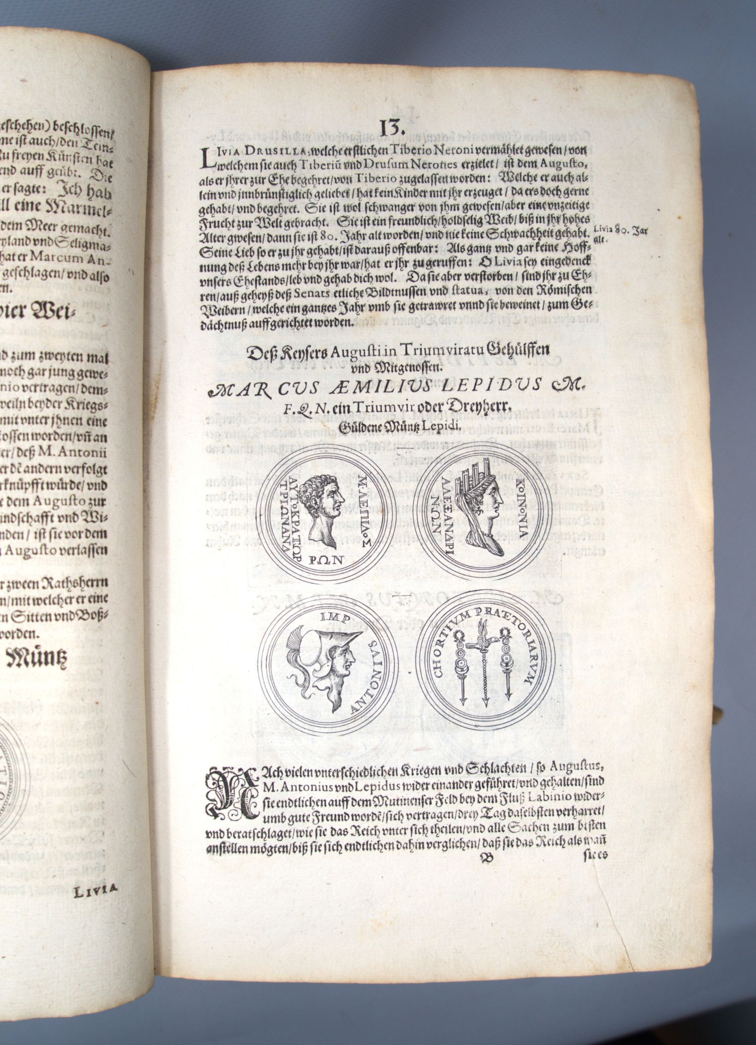 Strada à Rosenberg, Octavius de. Newe Keyser Chronick: Das ist, Wahrhaffte und vollkommene Beschreibung aller Römischen Keyser. Beneben Beschreibung ihrer aller, auch ihrer Gemahlinnen und Kinder Leben. Nunmehr aber biß auff gegenwertige Zeit also den Monat Aug. 1628 vollnführet und continuirt. 4 (statt 5) Bl. 596 S., 6 Bl. (l. w.). Mit szenischer gestochener Titelbordüre, Wappenkupfer und rund 570 Münzkupfern im Text. 29,5 x 19 cm. Pergament d. Z. (stärker fleckig und berieben, vorderes Gelenk geplatzt, mit hs. RTitel, Schließbänder teils lädiert). Frankfurt, Eberhard Kieser, 1629.
