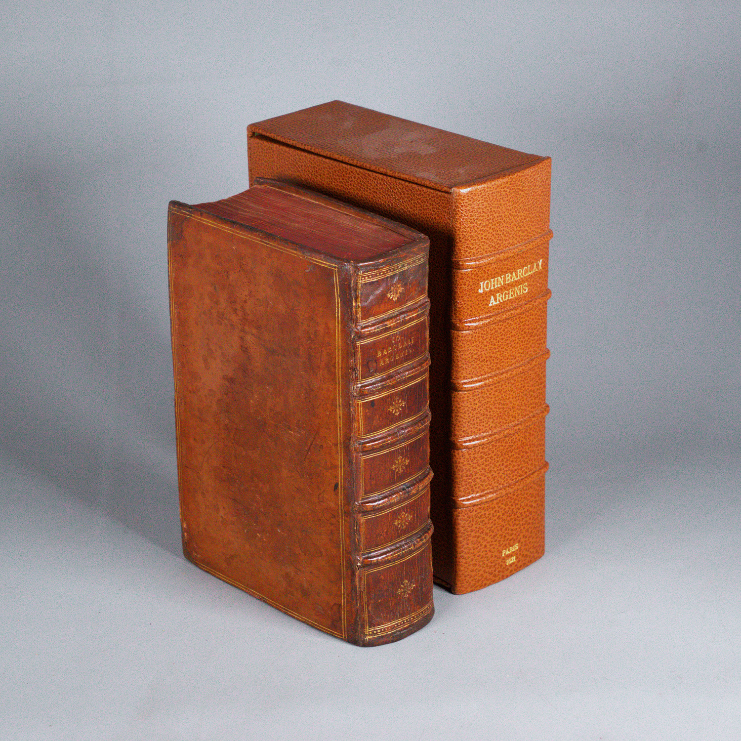 Barclay, John. Argenis. 8 Bl., 1208 S., 1 Bl. Mit Holzschnitt-Druckermarke auf dem Titel. 19 x 12,5 cm. Geglätteter französischer Kalbslederband d. Z. mit goldgeprägten Deckelfileten, ornamentaler RVergoldung und RTitel in gefütterter Lederkassette. Paris, Nicolas Buon, 1621.