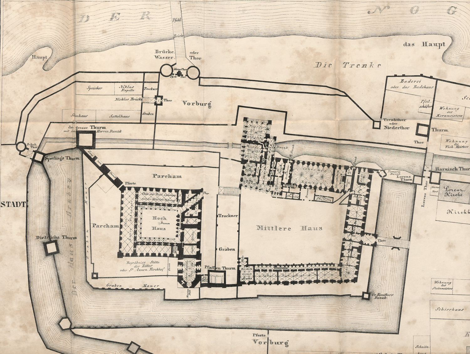 Eichendorff, Joseph von. Die Wiederherstellung des Schlosses der deutschen Ordensritter zu Marienburg. 1 Bl., 153 S. Mit mehrfach gefaltetem gestochenem Grundriss. 205 x 13,5 cm. Etwas späterer Halbleinenband. Königsberg, Th. Theile, 1844.