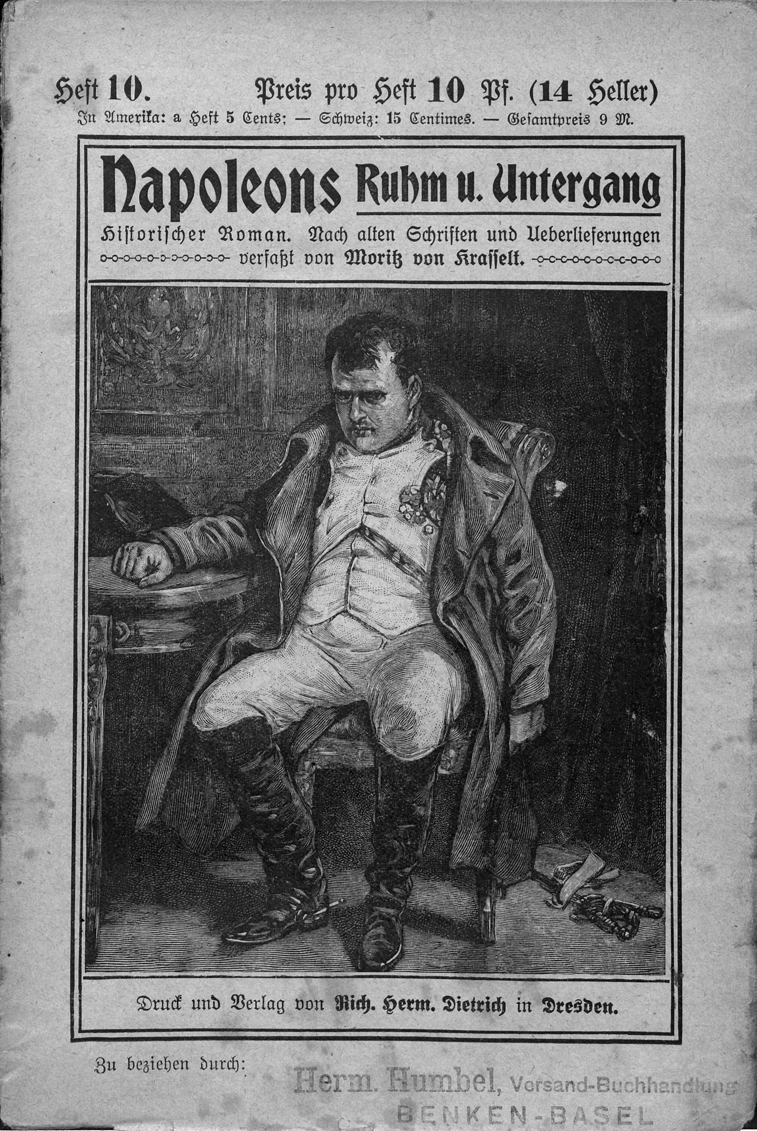 Kolportage. - Krasselt, Moritz von. Napoleons Ruhm und Untergang. Historischer Roman. Nach alten Schriften und Ueberlieferungen. 85 (statt 90) illustrierte OLieferumschläge. 2152 S. Mit zahlreichen Textillustrationen. 21,5 x 14,5 cm. OBroschuren (etwas fleckig und mit kleinen Randläsuren, teils lose und etwas lädiert). Dresden, Richard Hermann Dietrich, (1912).