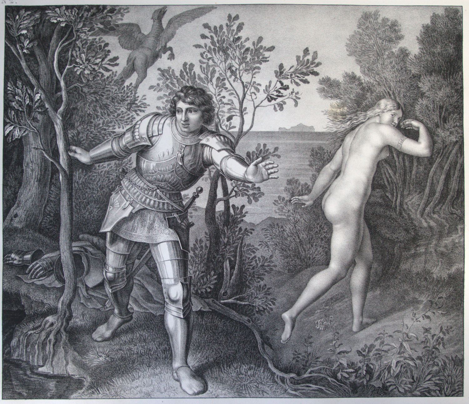 Schnorr von Carolsfeld, Julius. Sechs Bilder aus Ariosto's Rasendem Roland. 3 Bl. (Erläuterungen). Mit gestochenem Titel, gestochenem Widmungsblatt und sechs lithographischen Tafeln von Joseph Völlinger nach Julius Schnorr. 41 x 53 cm. Halbeder d. Z. (leicht fleckig und berieben) mit ornamentaler RVergoldung und goldgeprägtem RSchild, Deckelbordüre und kleinen goldgeprägten Kronen als Eckfleurons. Karlsruhe, Johannes Velten, (1833).