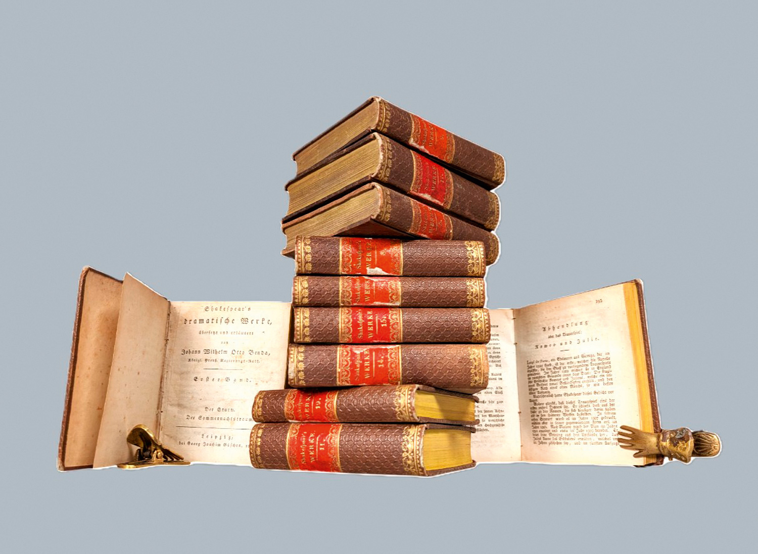 Shakespeare, William. Dramatische Werke. Übersetzt und erläutert von Johann Wilhelm Otto Benda. 19 Bände. 12 x 10 cm. Pappbände d. Z. (etwas berieben, Ecken leicht bestoßen) mit RVergoldung und rotem goldgeprägten RSchildern (teils etwas lädiert). Leipzig, Georg Joachim Göschen, 1825-1826.