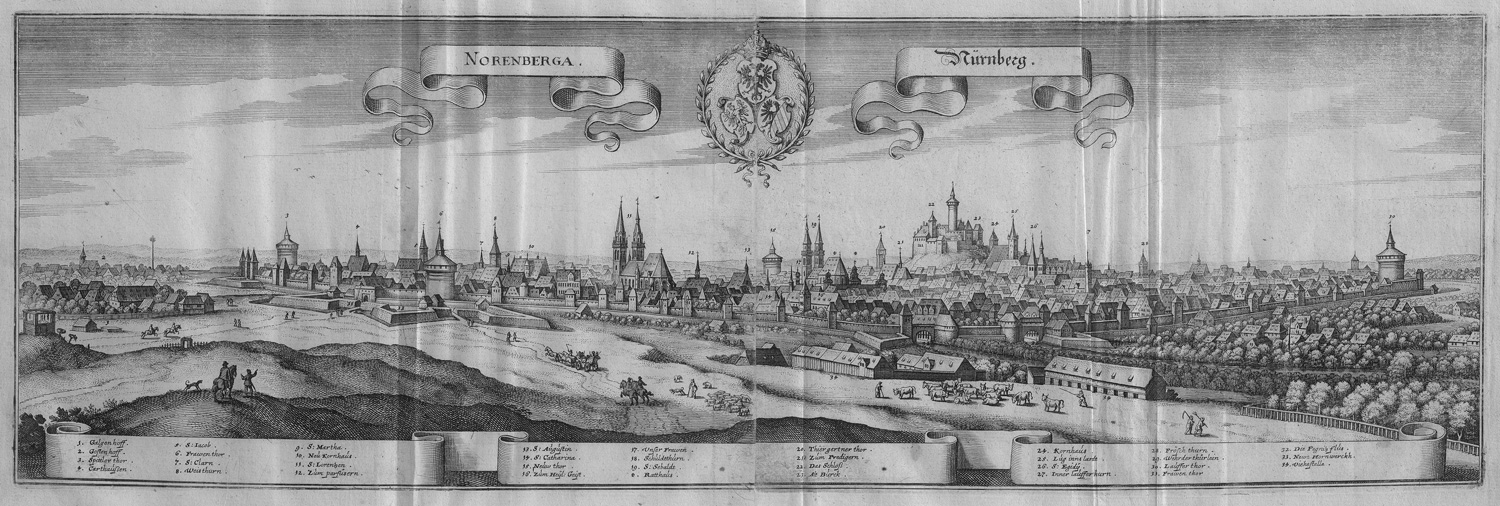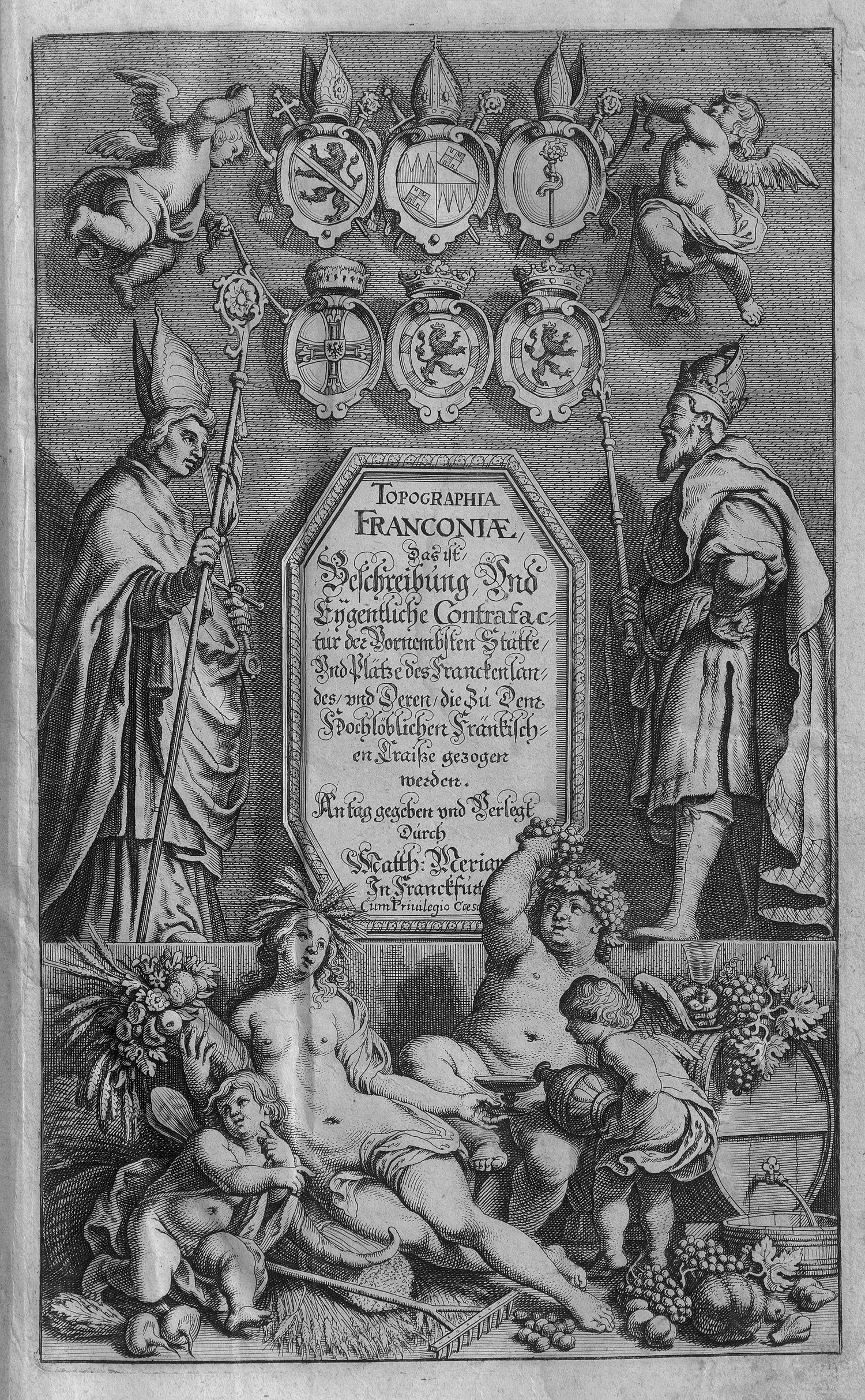 Wüthrich IV, S. 233f., Nr. 39-40. Schuchhard 40a u. 41a. VD17 39:131820E. – Erste Ausgabe. Der Kupfertitel zeigt u. a. den heiligen Bonifaz und Karl den Großen (oder Kaiser Heinrich II.) sowie Allegorien auf die Fruchtbarkeit (Ceres und Bacchus) und sechs Wappenschilde (Bamberg, Würzburg, Eichstätt, Mergentheim sowie zwei Mal die Burggrafschaft Nürnberg). Die Kupfer mit Ansichten von Bamberg, Coburg, Mergentheim, Nürnberg, Rothenburg ob der Tauber, Schweinfurt, Wertheim, Würzburg u. a. "Dreimal versah Merian eine Ansicht mit falschem Ortsnamen. Die Abtei Ebrach bezeichnete er als Gerolzhofen … und das Schloß mit der Kleinstadt Sonnenberg (heute in Wiesbaden aufgegangen) faßte er als das in Thüringen, nordöstlich von Coburg gelegene Sonnenberg auf. Der dritte Fehler passierte ihm beim Vogelschauplan von Neustadt an der Aisch, für welches er eine Vorlage benutzte, die Neustadt an der Saale darstellt. In den früheren Bänden lassen sich kaum vergleichbare Irrtümer nachweisen, was zu belegen scheint, daß Merian sich bei 'Franken' nicht mehr im gleichem Maße wie zuvor seinen Verlagswerken angenommen hat. Er war 1648 bereits leidend und weilte zeitweise in Bad Schwalbach, wo er zwei Jahre später auch verstarb" (Wüthrich). – Vorsätze erneuert. Teils mit hinterlegten Fehlstellen, ein Kupferstich lose, fast durchgängig mit größerem Feuchtrand, vereinzelt etwas braun- und fingerfleckig. Vollständiges Exemplar dieser Merian-Zeiller-Topographie.
