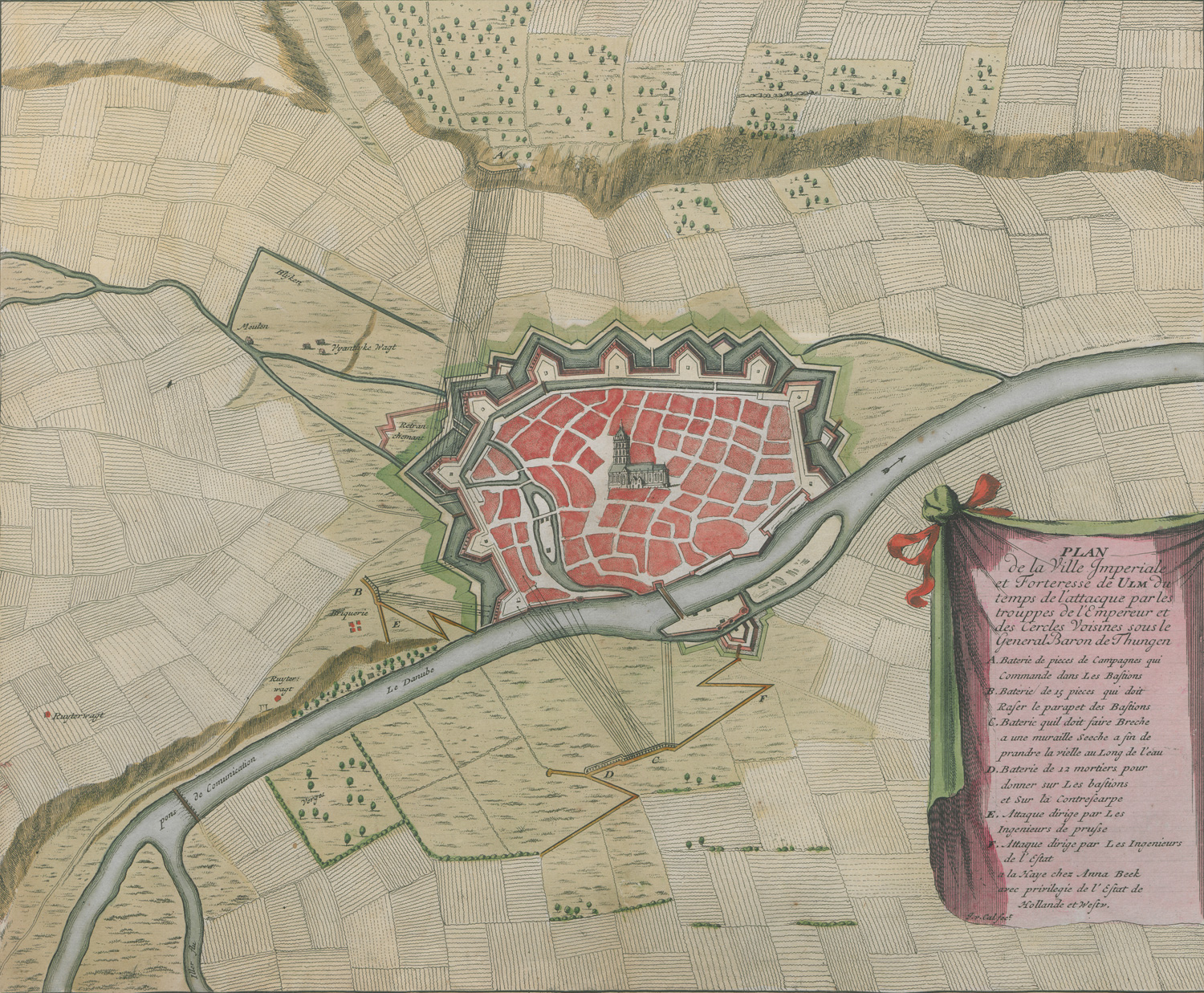Vorhanden sind: I. Hans Rudolph Manuel. Wahrhaffte Contrafehtung der Reichstatt Ulm, wie sie zu unser zeit im wesen ist. Holzschnitt. Um 1574. - II. Jean Dumont Baron de Carlscroon. Plan de la ville imperiale et forteresse de Ulm ... Kolorierter Kupferstich. 1729. - III. Matthäus Seutter. Ulma memorabilis ac permiunita libera imperii civitas ad Danubium ... 1741. – Teils mit Mittelfalz sowie mit kleineren Gebrauchsspuren, insgesamt gut erhalten.