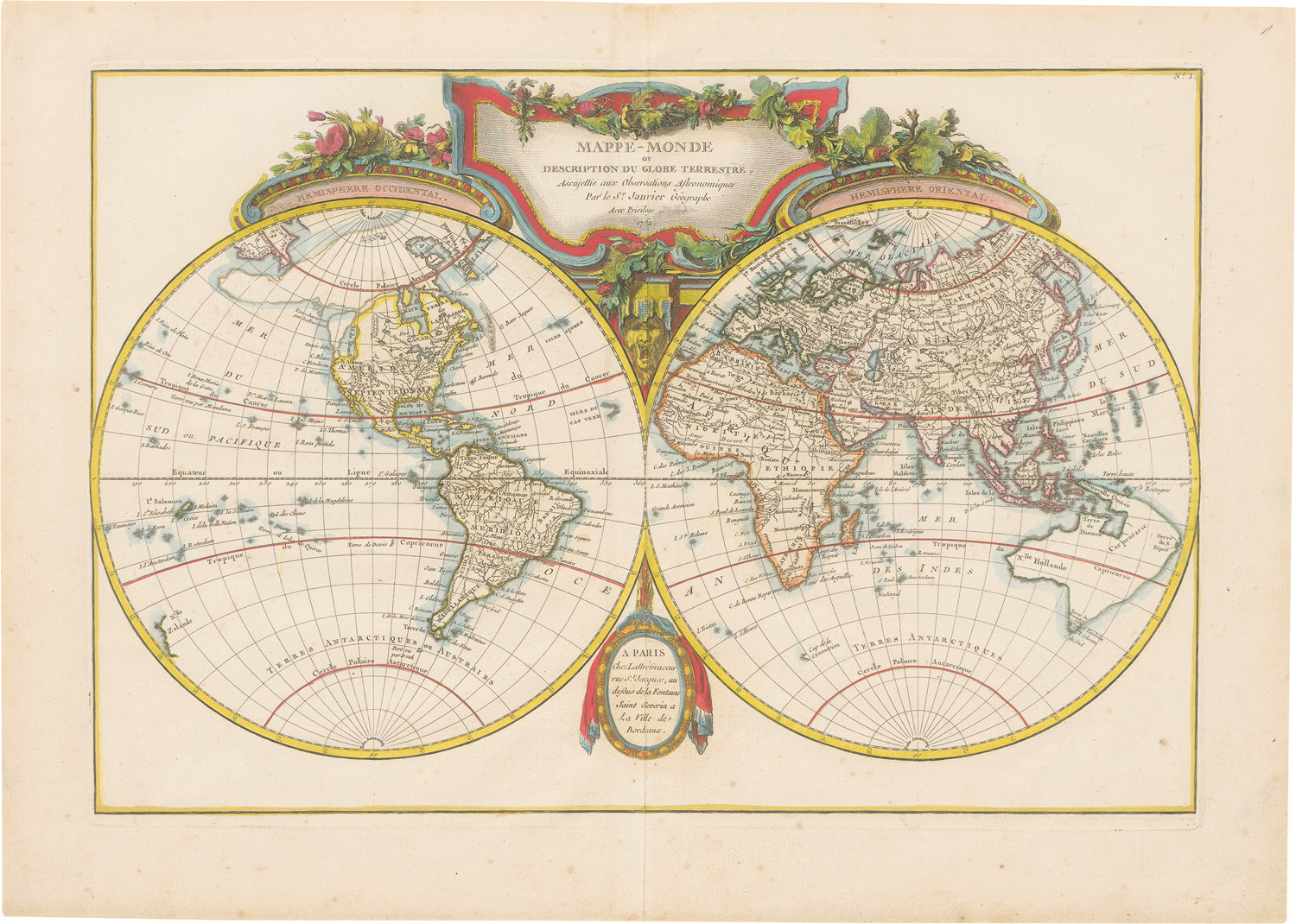 Seltene, kräftig kolorierte Kupferkarten von Jean Denis Janvier (1746-1776). Vorhanden sind: I. Mappe-Monde ou description du globe terrestre. No. 1. - II. L'Europe divisée en ses principaux etats. No. 2. - III. L'Asie divisée en ses principaux etats. No. 24. - IV. L'Afrique divisée en ses principaux. No. 28. - V. L'amerique divisée. No. 31. – Mit Mittelfalz, mit wenigen leichten Stockflecken, vereinzelt mit hinterlegten Fehlstellen. Insgesamt wohlerhalten, mit kräftigem Kolorit und sehr dekorativ.