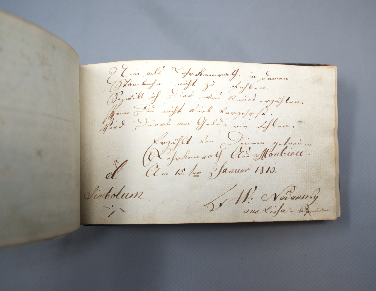 Stammbuch des Carl Felix Colberg aus Magdeburg oder Berlin, wo die Mehrzahl der Verwandten wohnte. Ca. 73 Bl., davon 41 S. beschrieben oder illustriert. Mit 7 aquarellierten Federzeichnungen und 3 kolorierten Kupferstichen. Quer-8vo. Brauner Lederband d. Z. (berieben, das Kapital etwas defekt) mit goldgepr. Bordüren auf beiden Deckeln, Rückenvergoldung mit Rückenschild "Der Freundschaft geweiht" sowie Stehkantenvergoldung und Goldschnitt. 1812-1814.