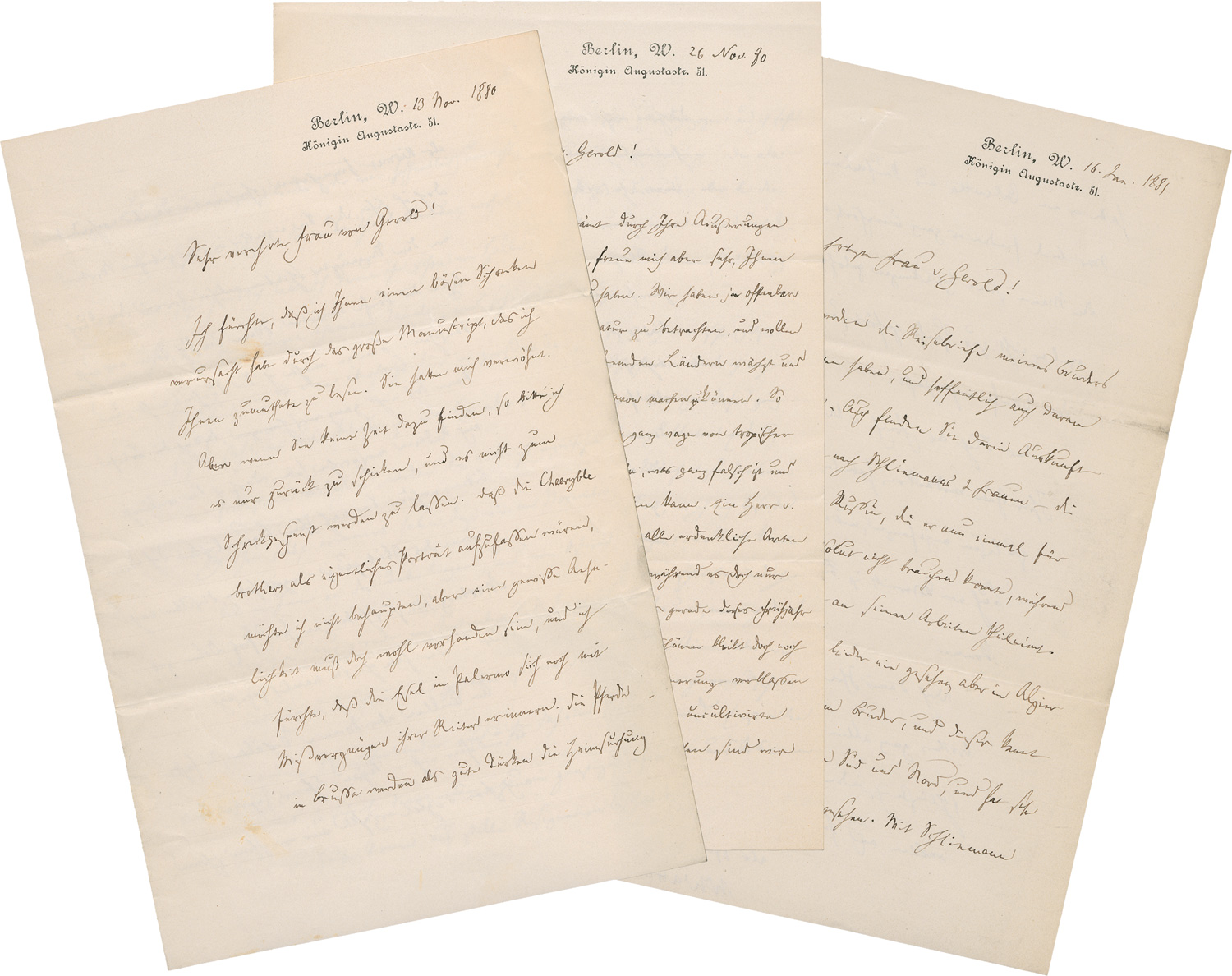 Wattenbach, Wilhelm, deutscher Historiker und Paläograf, Professor in Heidelberg und Berlin, Mitarbeiter der Monumenta Germaniae Historica und Quellenforscher des 19. Jahrhunderts (1819-1897). 18 eigh. Briefe und 1 Karte m. U. Meist Doppelblätter. 8vo. Berlin u.a. 13.XI.1880-14.IX.1890.