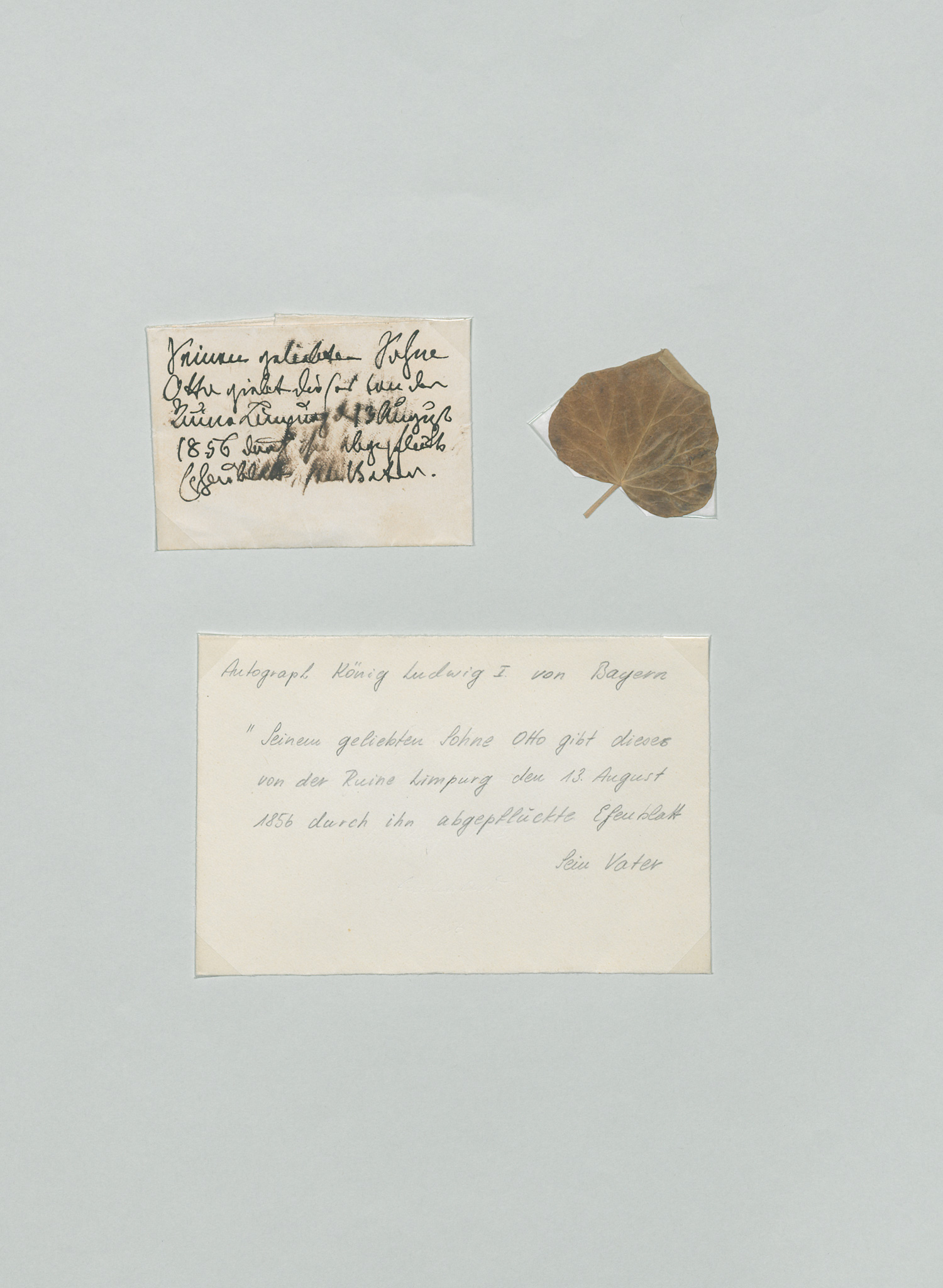 "Seinem geliebten Sohne Otto giebt dieses von der Ruine Limpurg d. 13. August 1856 durch ihn abgepflückte Epheublatt, sein Vater." - Die Tinte teilweise verwischt. - Das Schriftstück zusammen mit dem Efeublatt und einer kleinen Abschrift mit Foto-Ecken lose auf ein Untersatzblatt montiert.