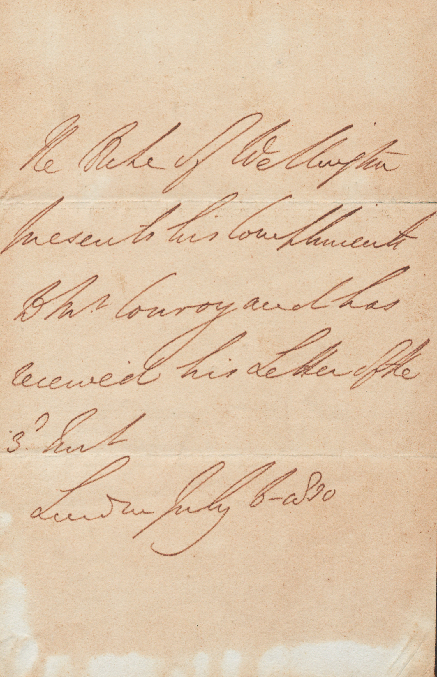 "The Duke of Wellington presents his Compliment to Mr Conroy and has received his Letter ...". - Etwas gebräunt und rückseitig unfrisch; 1 kleiner Faltenriss.