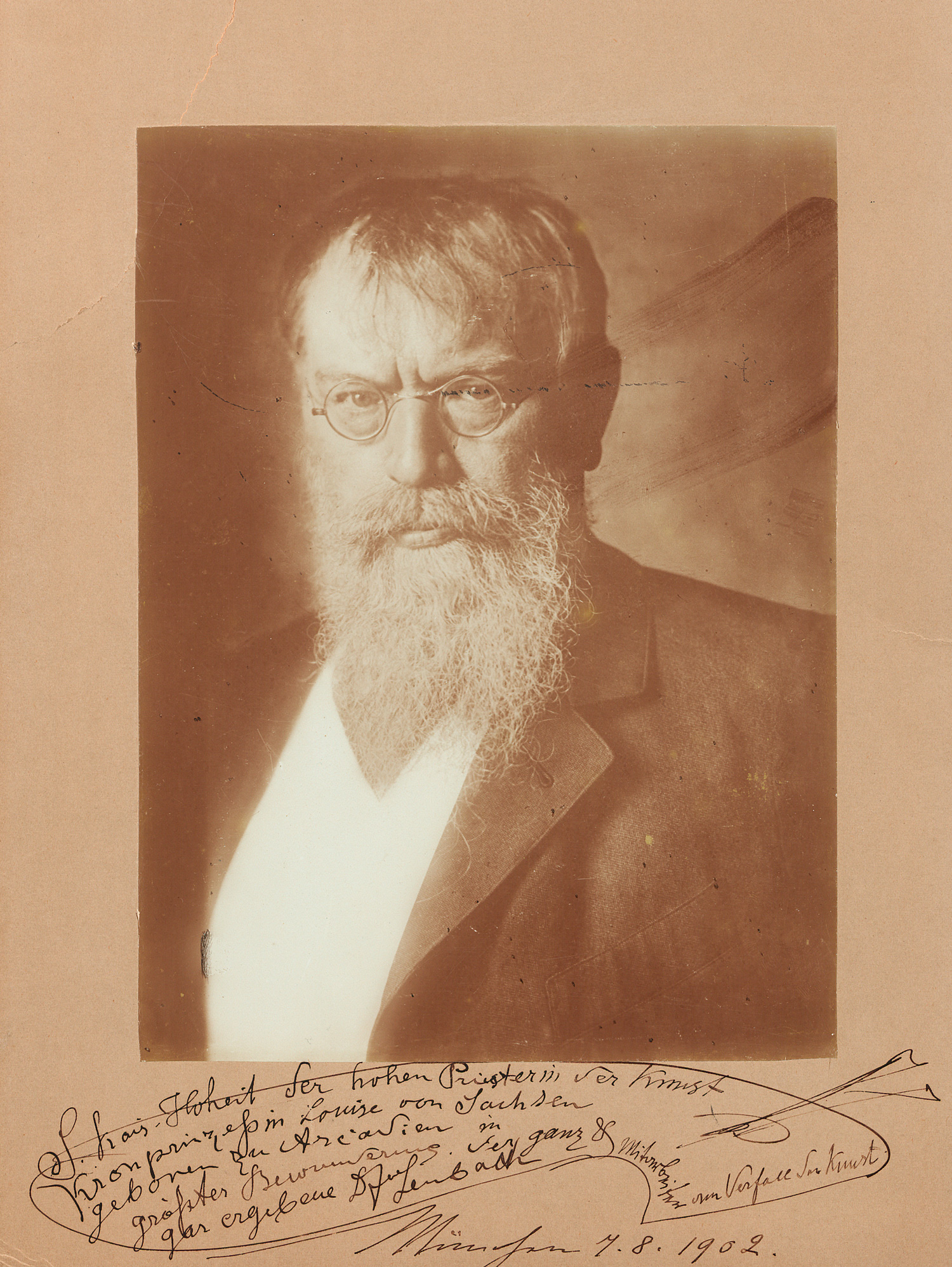 "S. kais. Hoheit der hohen Priesterin der Kunst, Kronprinzessin Louise von Sachsen, geboren zu Arcadien, in größter Bewunderung. Der ganz & gar ergebene D F v Lenbach, Mitarbeiter am Verfall der Kunst". - Die recht unseriös klingende Widmung passte zu der Bewidmeten: Die Kronprinzessin Luise von Österreich-Toskana (1870-1947), die sich 1891 mit dem Prinzen Friedrich August von Sachsen vermählt hatte, begann in diesem Jahr ein äußerst unruhiges Leben mit vielfach wechselnden Aufenthalten, mehreren Liebhabern, neuen Bindungen und insgesamt 8 Kindern von verschiedenen Vätern. - Der Untersatz-Karton an einer Ecke angeknickt, mit leichter Berührung des Fotos.