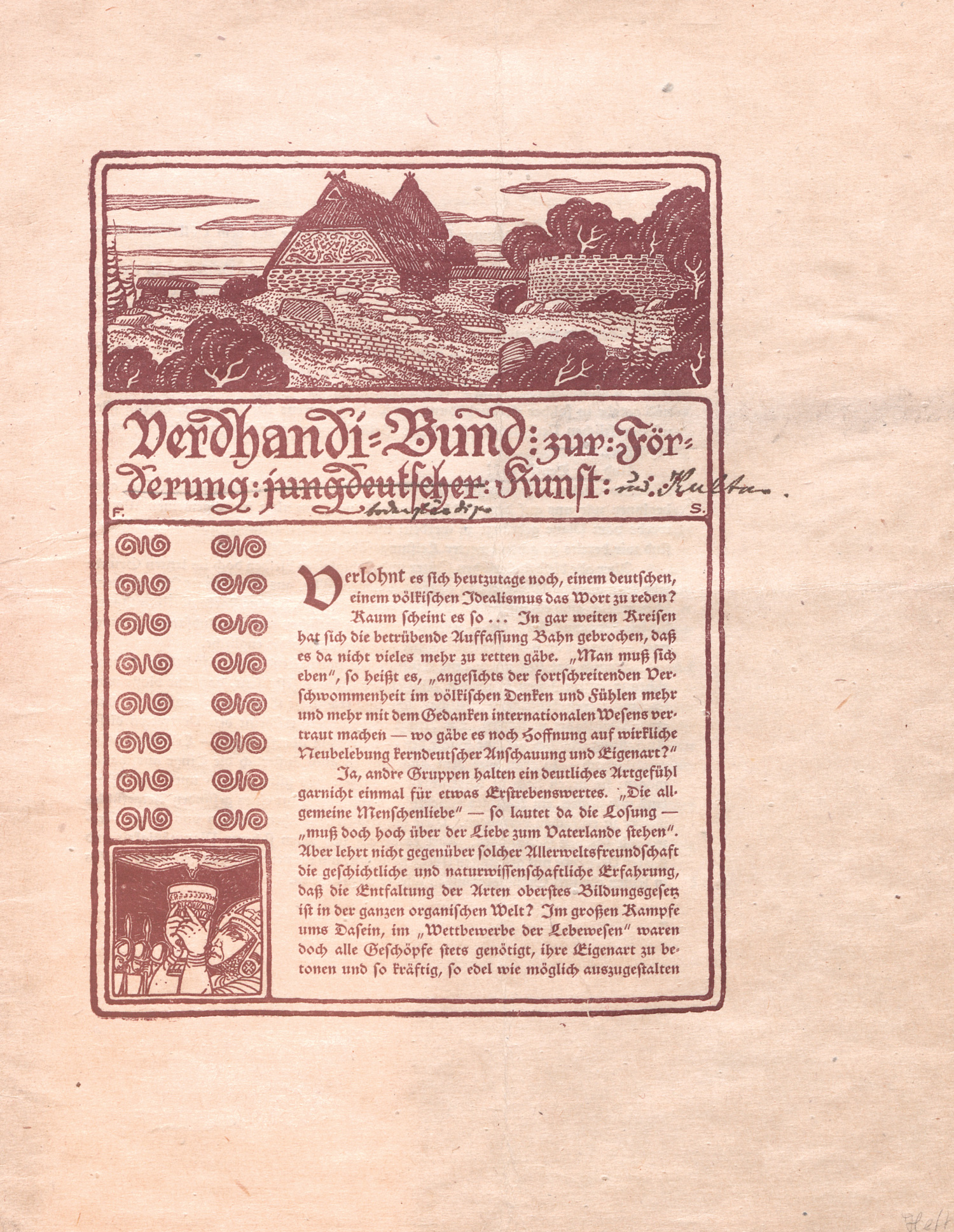 Geänderte Version des Programm- und Propaganda-Heftes der extrem deutschnationalen und völkischen Bewegung. Es fehlt der große, düstere und wenig anziehende Textholzschnitt von Friedrich Seesselberg, und der Text ist stellenweise umformuliert. Statt "Von undeutscher Lebensverneinung zurück zu fröhlicher Lebensbejahung" heißt es hier: "zu frischer Lebensbejahung". Und der Titel ist handschriftlich (wahrscheinlich von Heinrich Vogeler) verändert: die Formulierung "zur Förderung jungdeutscher Kunst" ist mit Tinte gestrichen und ersetzt durch "bodenständiger Kunst und Kultur". Am Schluss haben (meist mit Bleistift) signiert: H. Wagner (Bremen), A. Hahn (Schöneberg bei Berlin), der Maler Hans am Ende (Worpswede), der Maler, Graphiker und Illustrator Heinrich Vogeler (Worpswede), der Maler Otto Modersohn (Worpswede), der Maler Richard Hartmann (Worpswede), der Kunsthistoriker und Museumsdirektor Dr. Karl Schaefer und der Architekt Emil Högg. - Bemerkenswert ist, dass diese Gruppe von Künstlern und Kunsthistorikern bei der Gestaltung des Heftes offensichtlich für Mäßigung in Titel und Formulierungen eintrat. - Leichte Gebrauchsspuren.