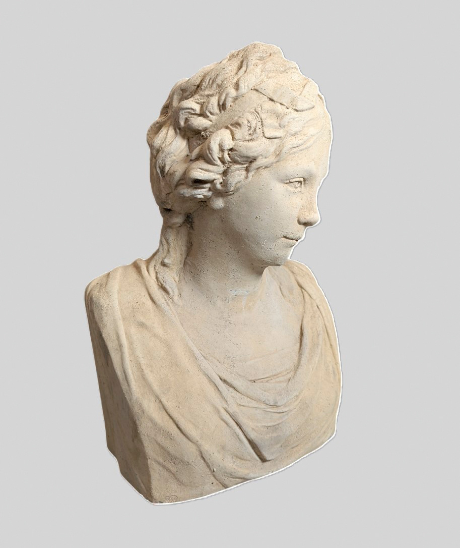 Die hier in sehr feiner Manier aus schwerem, tonigen Steinguss hergestellte Büste Friederikes gehört zu den wenigen Exemplaren, die in dieser Form nachweisbar bzw. noch erhältlich sind. Sie unterscheidet sich deutlich in Qualität und Massivität von zahlreichen Gipsnachbildungen, wurde hier möglicherweise in wenigen Einzelstücken in einer englischen Steinguss-Werkstatt hergestellt.