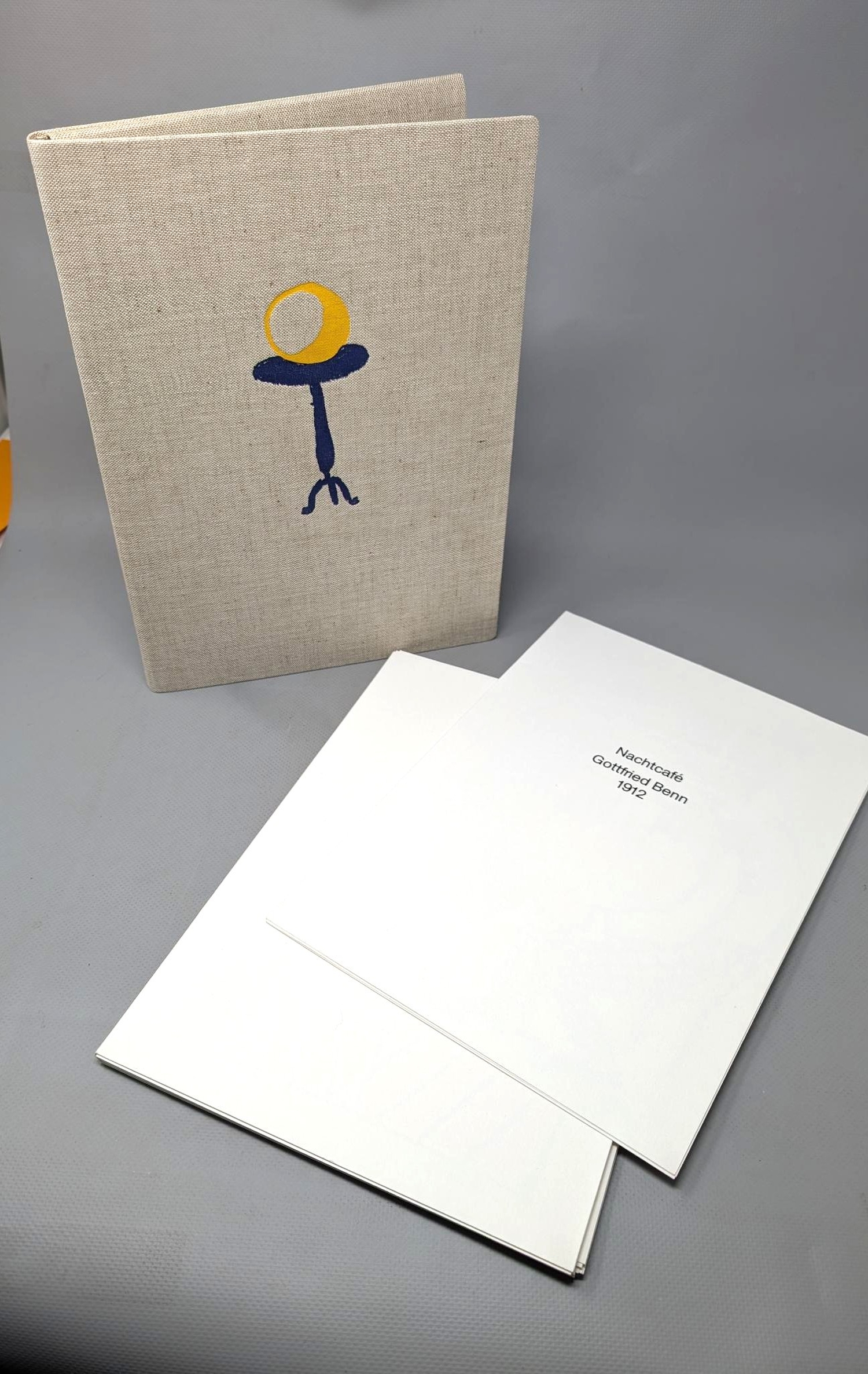 Benn, Gottfried. Nachtcafé. 1912. 3 Bl. Titel, Text und Druckvermerk. Mit 15 signierten Original-Siebdrucken sowie einer farbigen Original-Kreidezeichnung von Peter Borowski. 29,5 x 24 cm. Lose Blätter in OLeinen-Flügelmappe mit farb. Deckelillustration. (Bielefeld), Edition Jesse, 1986.