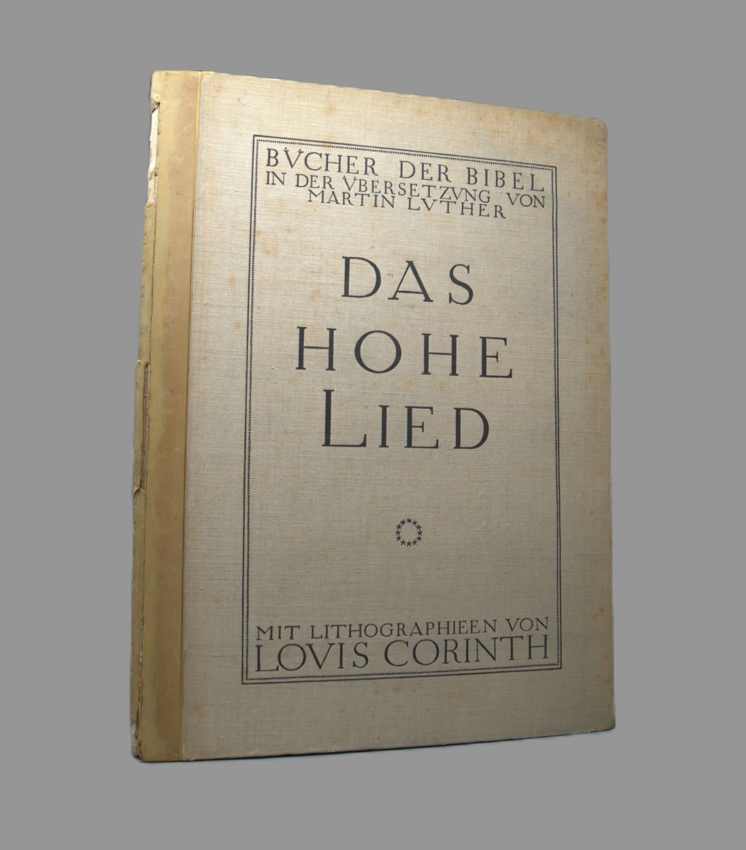Bücher der Bibel in der Übersetzung von Martin Luther. - Rodenberg 452. Caspers 3.5. Hayn-Gotendorf IX, 286. Schwarz L 82. Feilchenfeldt-Brandis 29.B.a. – Fünftes Werk der Panpresse. Eines von 250 numerierten Exemplaren auf Strathmore-Japan (Gesamtauflage: 310), hier in der edleren der beiden Einbandvarianten in Halbkalbleder. Der Text von Else Penzig geschrieben und lithographiert. "'Alles meilenweit ab von der landläufigen Bibelillustration, aber den wahren Inhalt der morgenländischen Geschichte tiefer packend als je ein früherer Illustrator', so schliesst Max Osborn eine Besprechung der Lithographien zu dem Buche Judith. Der Meister lässt jetzt das Hohe Lied folgen. Leicht möglich, dass den einen oder anderen Beschauer - der an eine fromme und sanfte Auffassung des Hohen Liedes gewöhnt ist - die starke männliche Sinnlichkeit seiner Visionen, die Wildheit der Linien, die Kühnheit der Farben erschrecken. Aber wessen Seele ein starker Trunk mundet, wem die Brust sich weitet beim Anblick des Ausbruches eines grossen Temperamentes, einer originellen Phantasie, einer männlichen Kraft des Ausdruckes, der wird den Visionen Corinths, die in dem neuen Werk der Pan-Presse niedergelegt sind, ein dankbarer Beschauer sein.