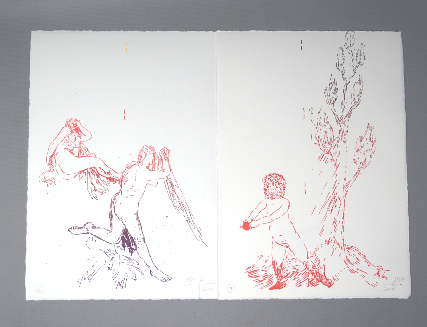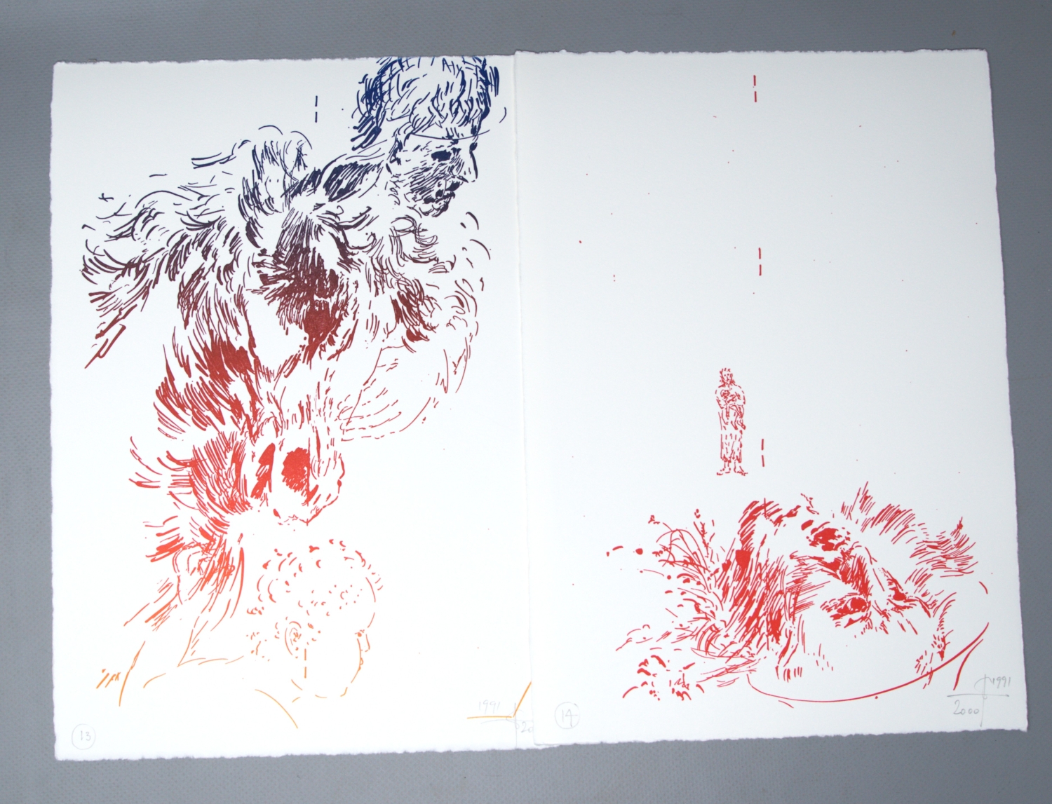 Hafner, Jonas. 24 Bilder während eines Krieges (Umschlagtitel). Mars auf Reisen. Folge von 24 farbigen Lithographien. 29,5 x 21 cm. Lose Blätter in OUmschlag mit hs. Titel und 2 Deckelillustrationen in OHolzschnitt. Hamburg, Edition Griffelkunst, 2000.